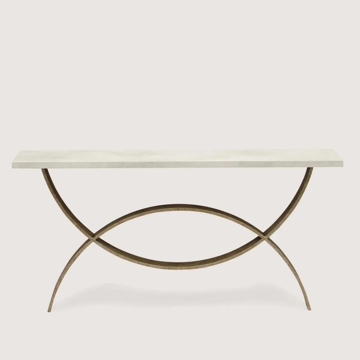 The Fishtail Console Table consists of two interlinking semi-circles and is available with any wooden or marble top and can be custom sized. Shown with faux limestone top.