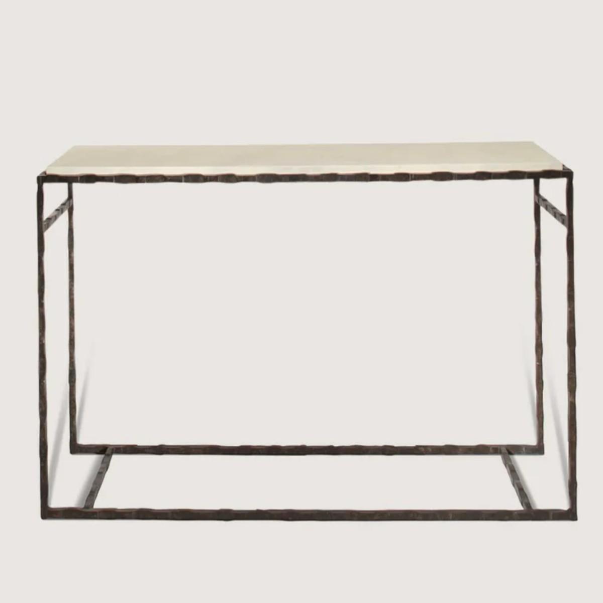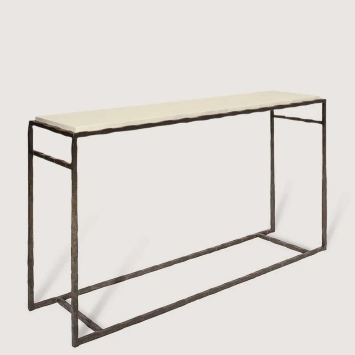 I’m a fan of the Giacometti console for its architectural bronze-iron frame and crisp stone top - it feels both substantial and light. It works equally well in a pared-back modern hallway, an industrial living room or even a refined country kitchen, where its slim profile won’t overwhelm. For styling, keep it uncluttered: place a sculptural ceramic vase or a small stack of design books at one end, balance with a slim table lamp or a simple mirror on the wall above. A low bowl for keys or a single stem in water will add just the right touch without hiding the table’s elegant lines.