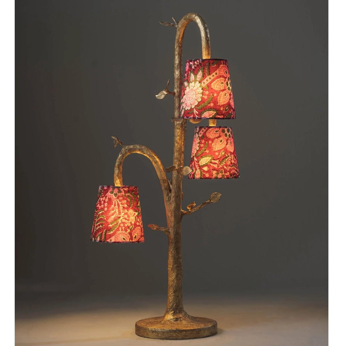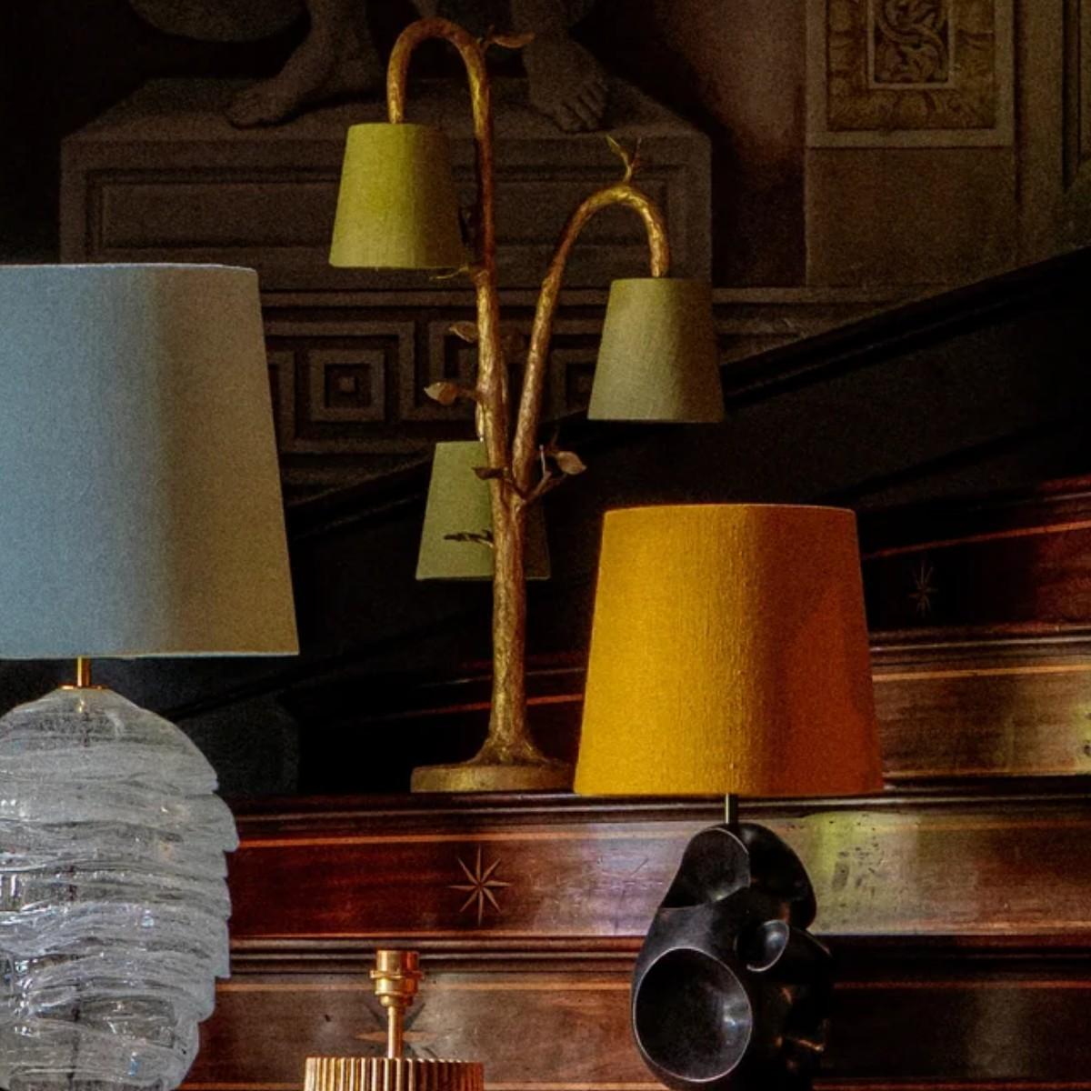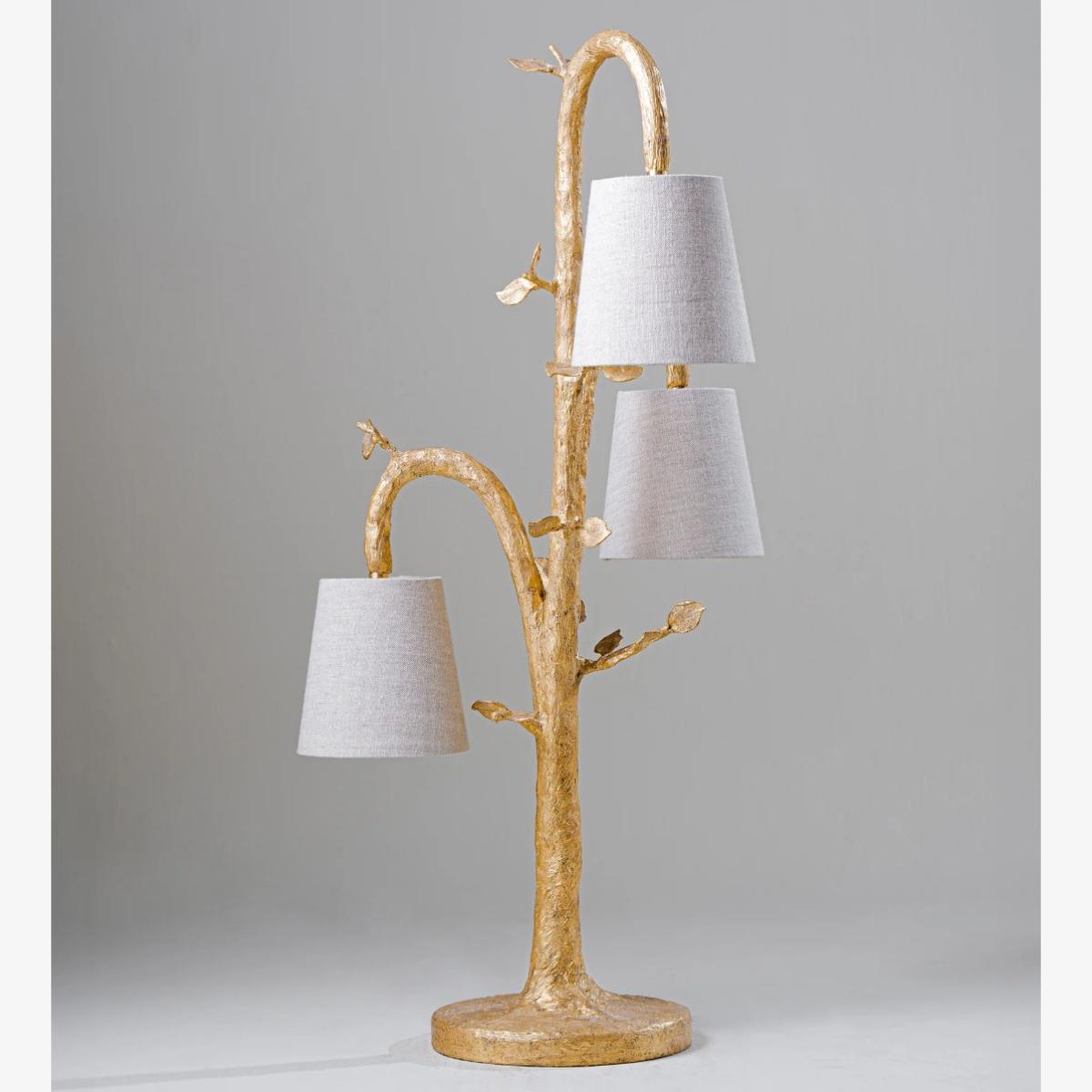 An elegant and decorative table lamp, the Ginny is large in scale. Three sculpted branches suspend their lampshades like hanging fruit. Hand-textured and decorated in eight separate layers by our painting studio to create the impactful Decayed Gold finish. Also available in any painted finish of your choice. Many Porta Romana pieces are fully customisable. Products can be scaled up or down, proportions can be changed, and designs can be painted to your choice. Please contact us for options and best pricing. For ALL Porta Romana orders going to the USA, a 20% wiring surcharge is applied to each item.