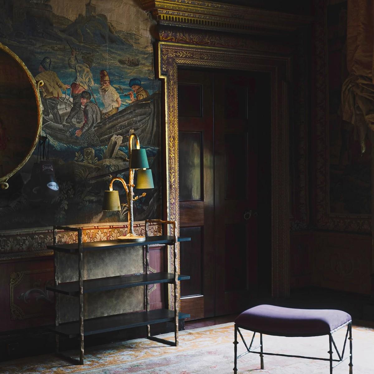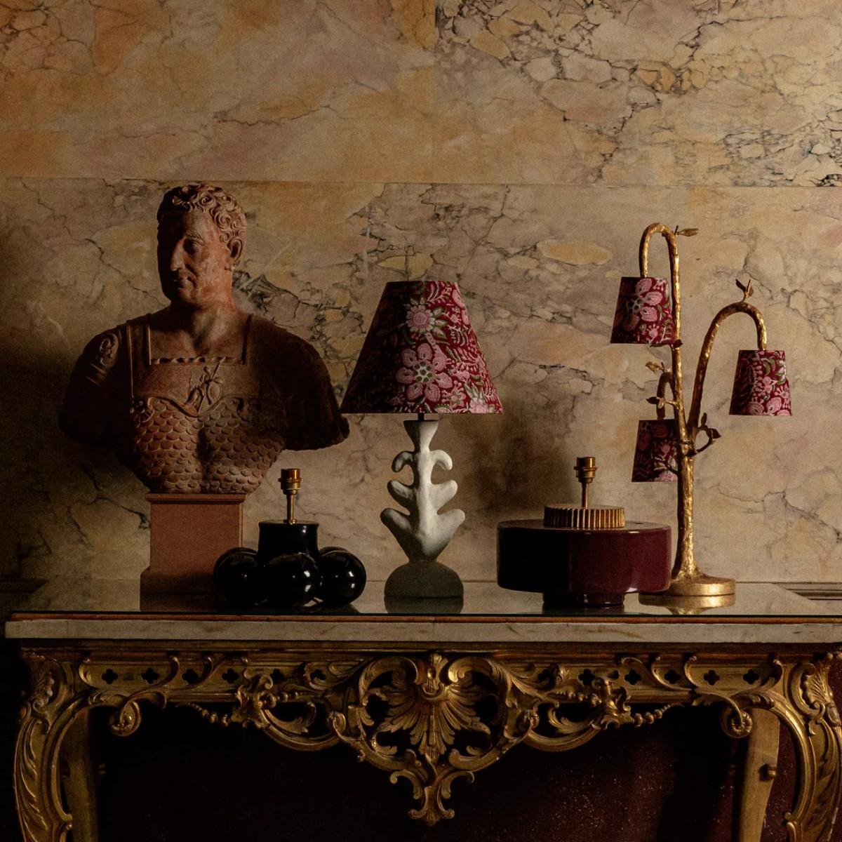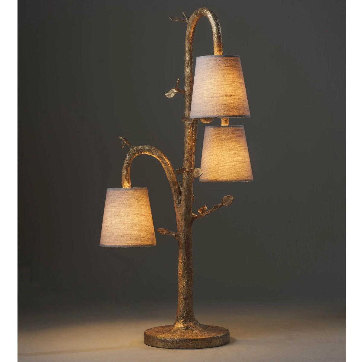 An elegant and decorative table lamp, the Ginny is large in scale. Three sculpted branches suspend their lampshades like hanging fruit. Hand-textured and decorated in eight separate layers by our painting studio to create the impactful Decayed Gold finish. Also available in any painted finish of your choice. Many Porta Romana pieces are fully customisable. Products can be scaled up or down, proportions can be changed, and designs can be painted to your choice. Please contact us for options and best pricing. For ALL Porta Romana orders going to the USA, a 20% wiring surcharge is applied to each item.