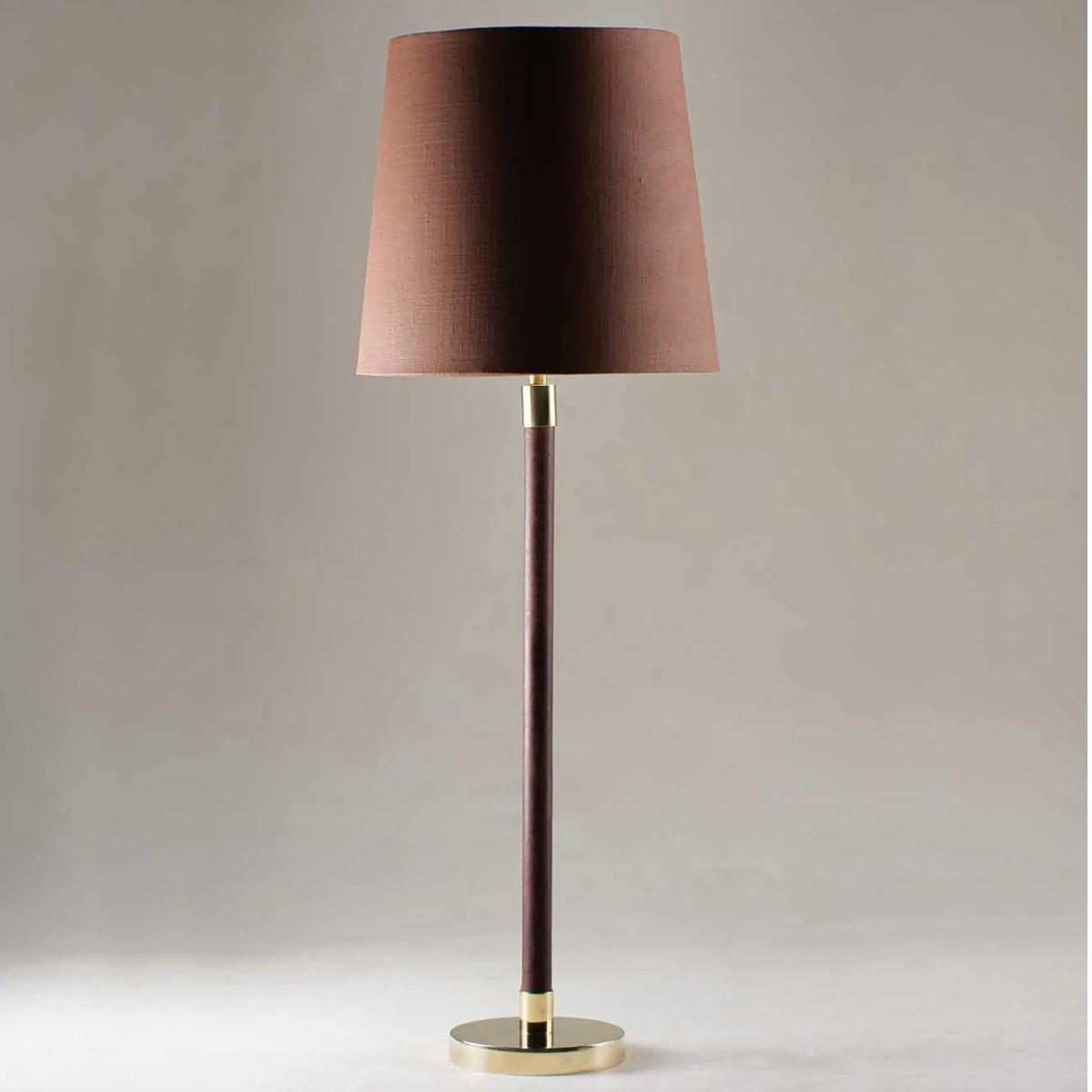 The Huxley family was conceived to follow the versatile design of the Holden pieces. The leather used on the stem of the lamp is coloured using plant-based materials and environmentally efficient techniques. Chocolate Leather shown with Brass Base with 10 Bongo in Painted Tan with Cream Card lining.