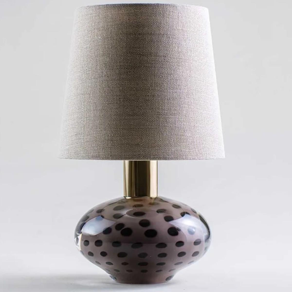 Small attention-grabbing and cute the Auden lamp is formed of blown glass and Patinated Brass and is produced locally. Each Auden lamp has its own character formed by the artistry of the glass blowing technique. The lamp’s dotted surface is both playful and decorative resembling the paintings of Yayoi Kusama. Shown with 10 Bongo in Natural Linen with Cream Card lining.