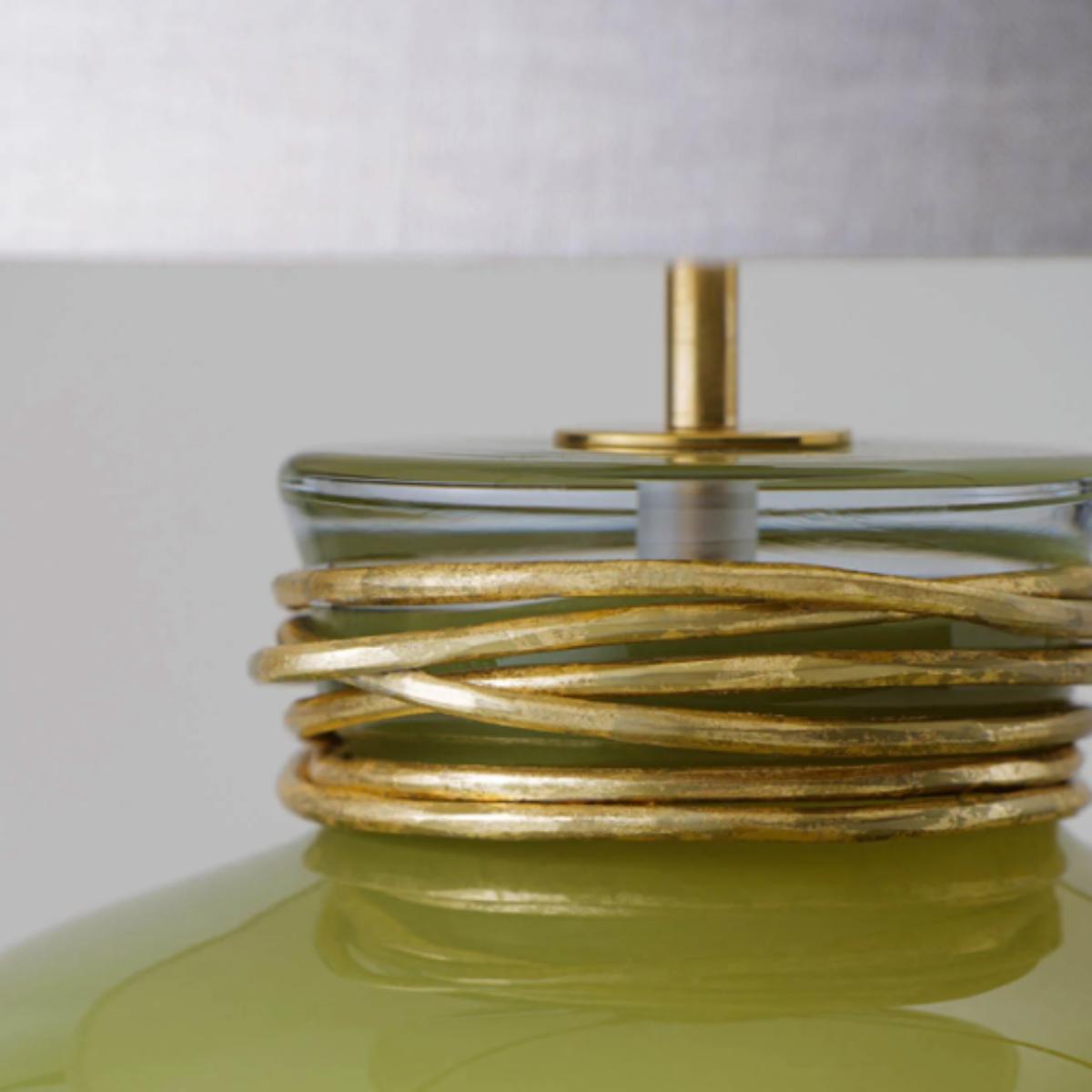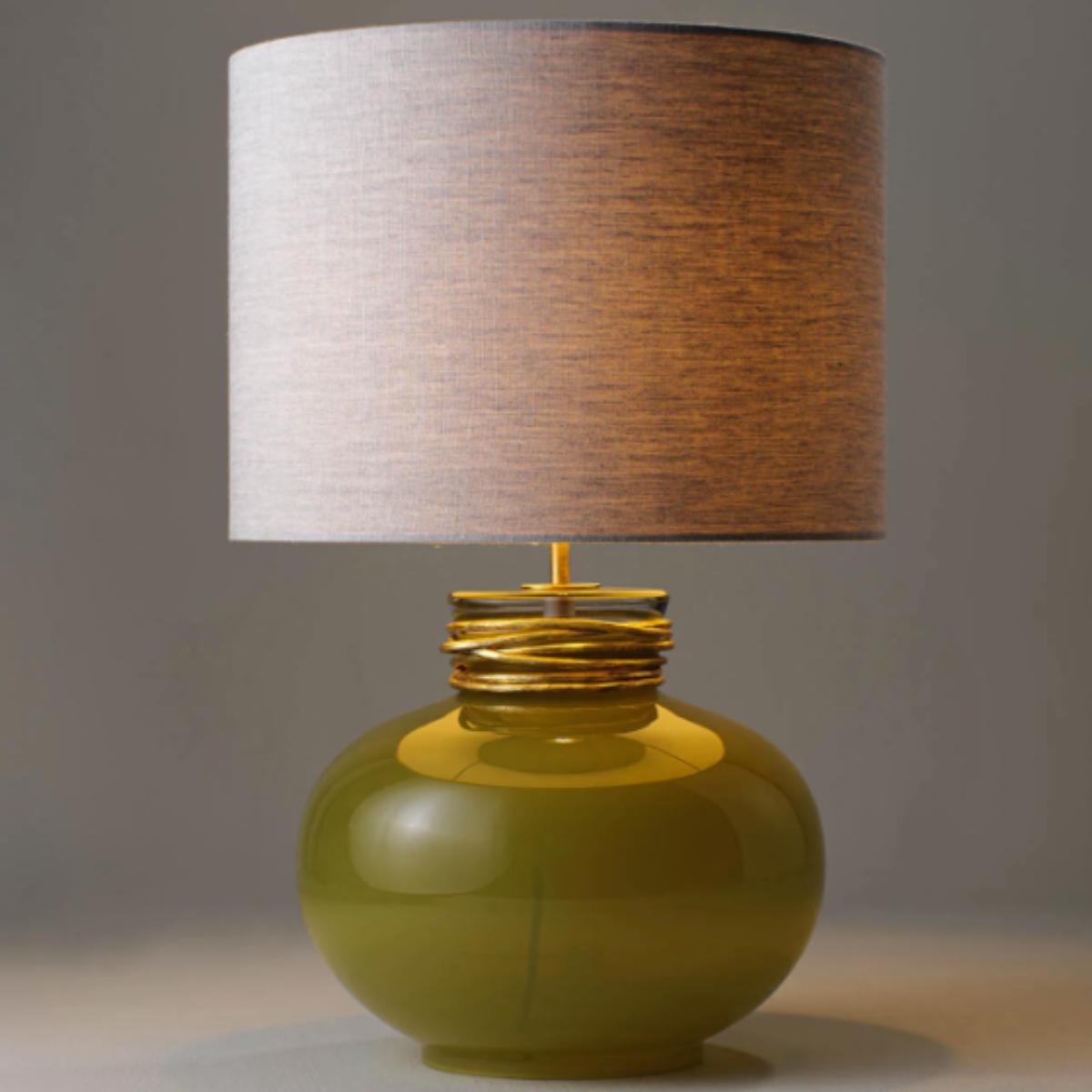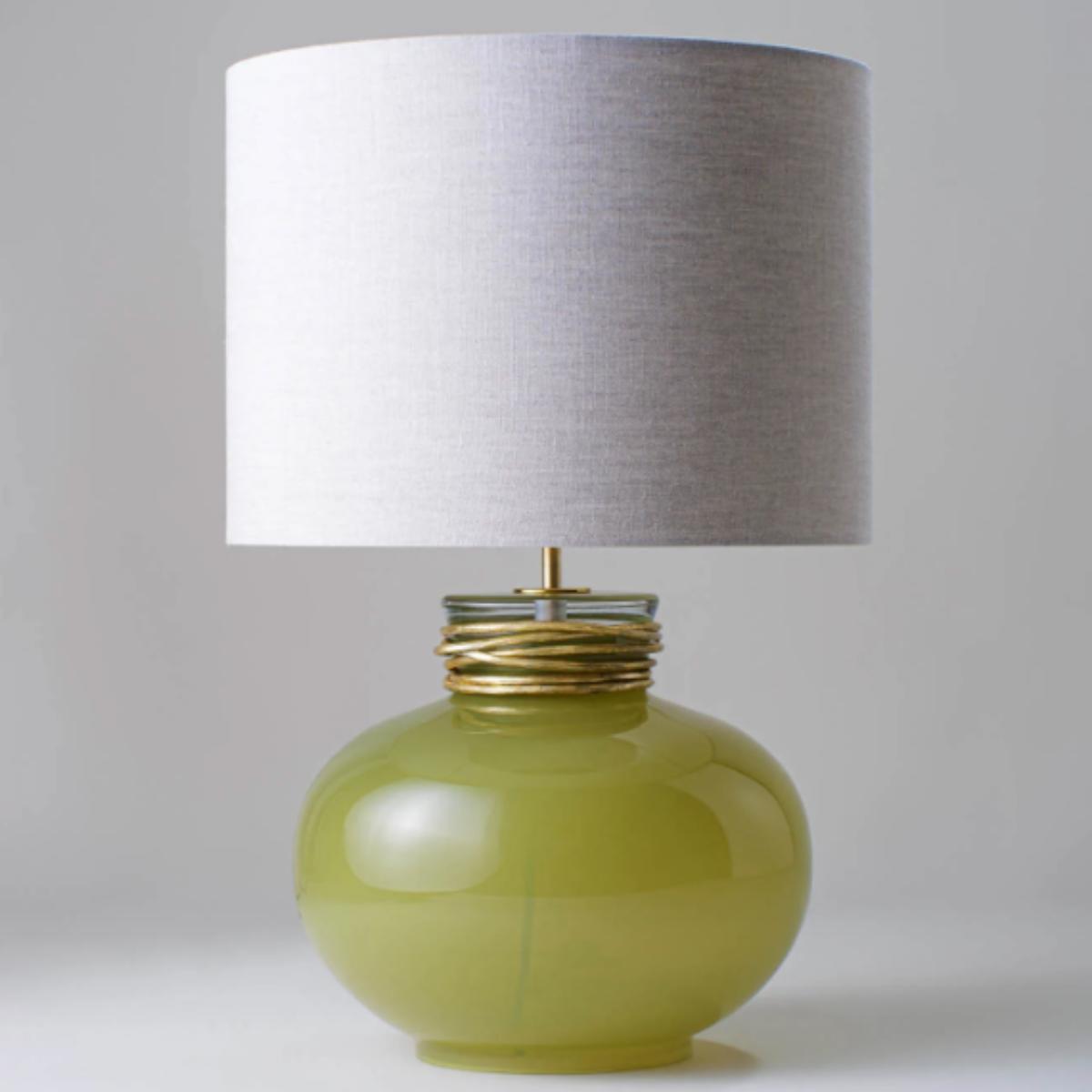 The Boudica table lamp is hand blown in glass and was inspired by a 5,000 year old piece of Egyptian glass from The Museum of Egyptian Antiquities in Cairo. Each Boudica is entirely unique, as the delicate metal collars are each twisted by hand, and their bright gold detailing creates a compelling contrast to the darker, earthy tones of the glass. Split Pea with Bodu Gold collar shown with 16" Tall Cylinder in Natural Linen with Cream Card lining. Many Porta Romana pieces are fully customisable. Products can be scaled up or down, proportions can be changed, and designs can be painted to your choice. Please contact us for options and best pricing.