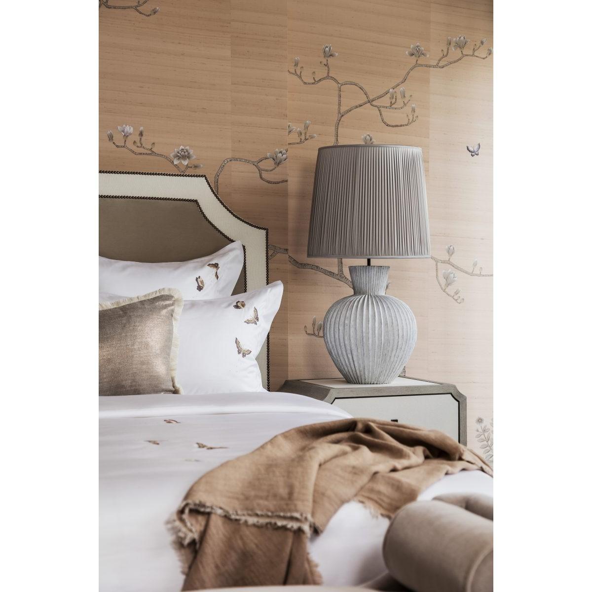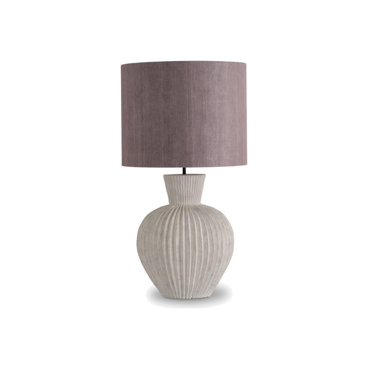 Informed by the simplicity of Japanese ceramics, Constance is fashioned from sharp, curved pleats that reference origami. Its conceptual shape, executed in cast composite, even inspired a new finish – Dappled White – which perfectly accentuates its fine form. IMAGE SHOWS 18 INCH TALL CYLINDER SMOG SILK LINEN WARM GREY SATIN LINING.