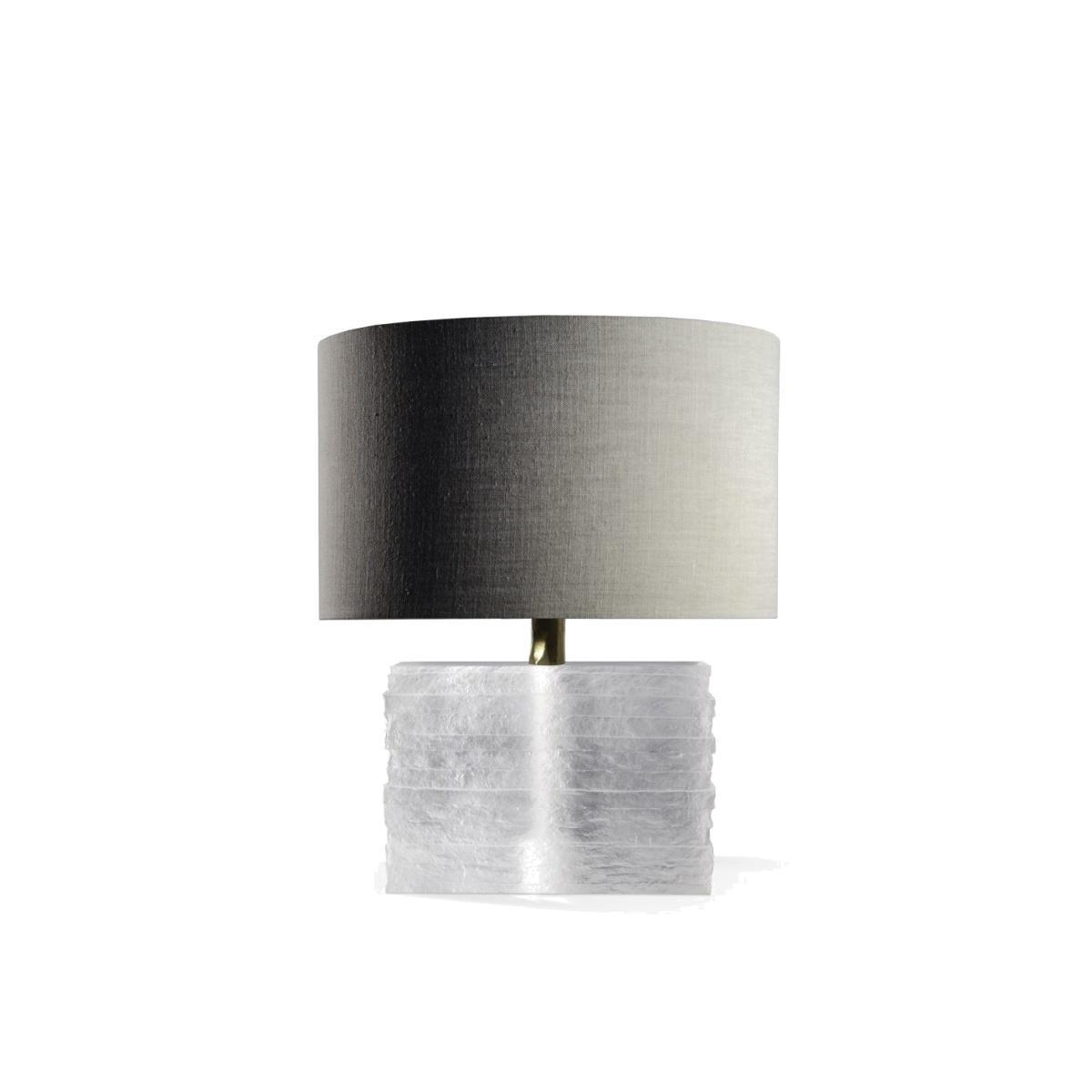 The Crystal Strata lamp is a magnificent block of cast glass. The light that plays across the textured surface is quite gorgeous and the beautifully sculpted neck can be finished in either brass or nickel plate. Our Quick Ship service has this with a Putty shade, but the base looks equally stunning in any one of our gorgeous silks and linens, and really suits a contrast lining.