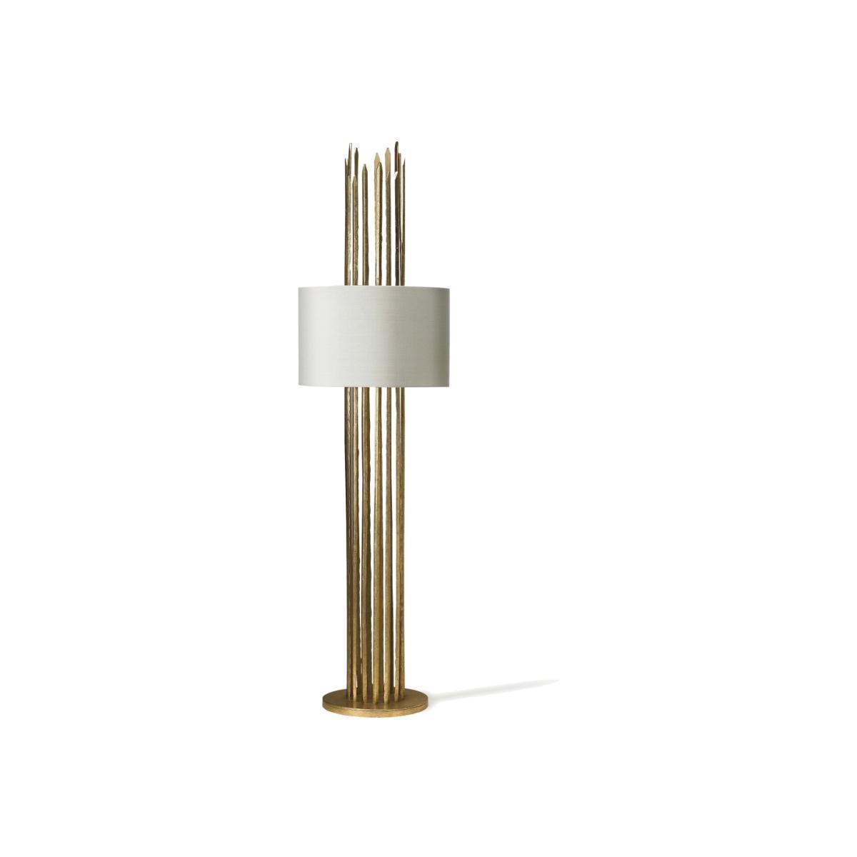 A tall skeletal structure over a metre high and reaching up towards the sky. Table Lamp formed from a tight cylinder of beaten ‘Flynn’ strips.