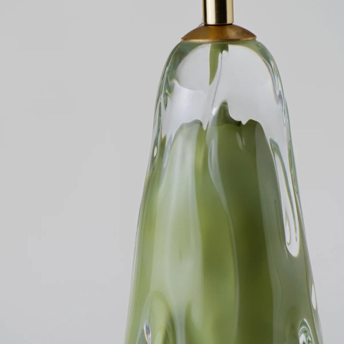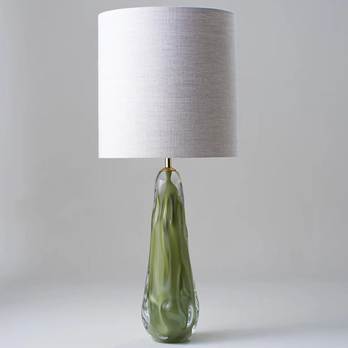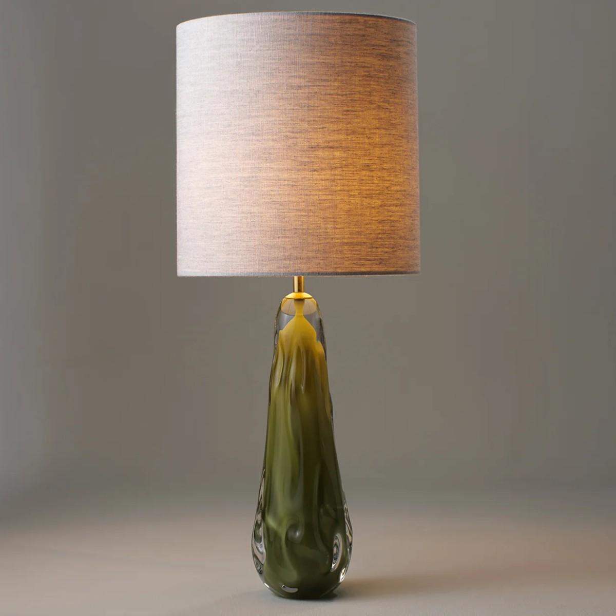 I love this lamp for its sleek, modern silhouette combined with the playful green glass base, which instantly adds character without overwhelming a space. It's versatile enough to work well in both contemporary and eclectic interiors - think a neutral living room, a chic bedroom, or even a stylish office. For practical styling, consider placing it on a side table or a console to create a cosy desk corner; pairing it with other green or earthy tones can also enhance its natural vibe. The muted linen shade diffuses light softly, making it ideal for ambient lighting, while the contrasting textures invite visual interest. Overall, this piece combines form and function effortlessly, bringing a touch of understated sophistication.