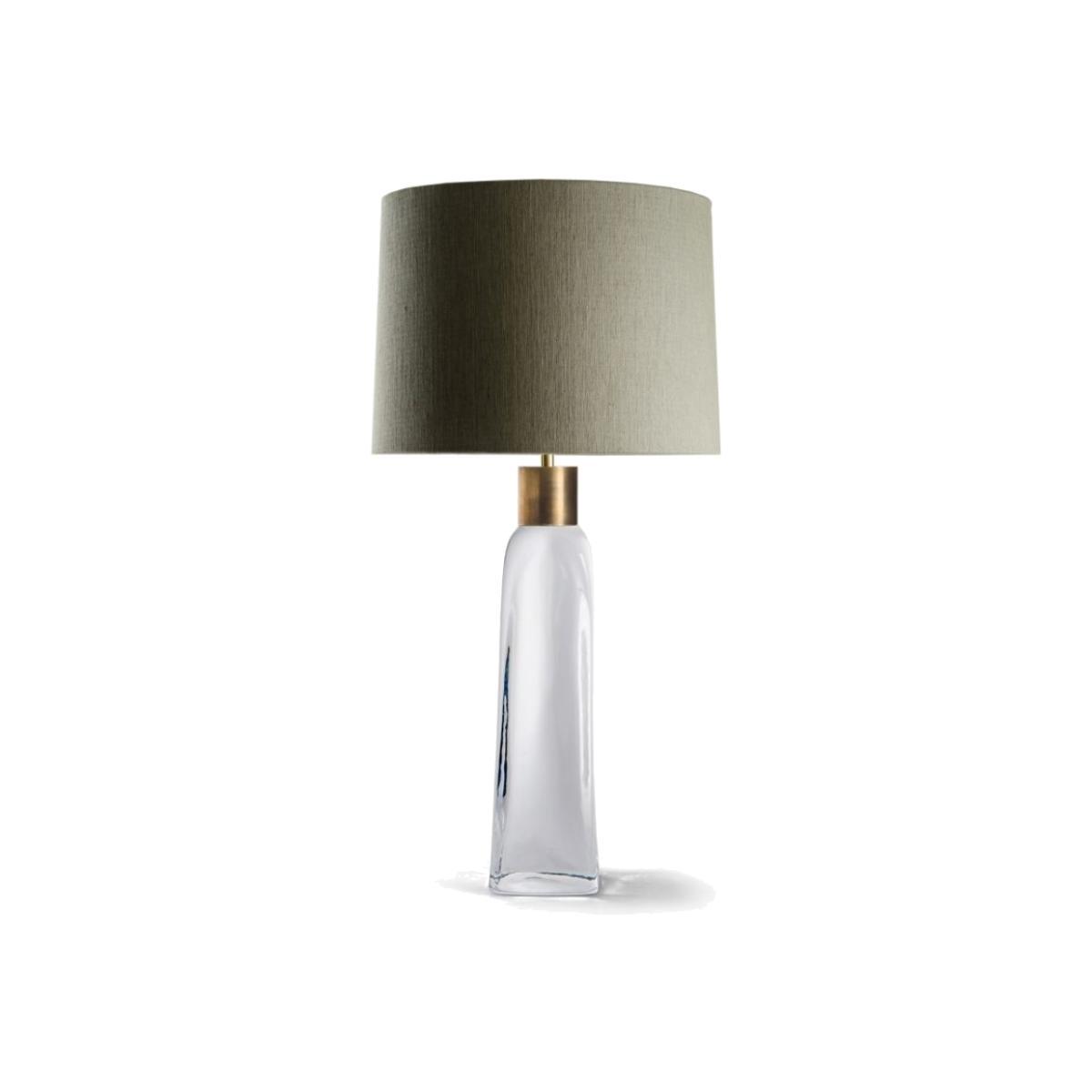 Available in two sizes, the Fitzgerald lamp is available only in clear glass. It has tremendous weight and ripples like an oversized ice cube. Finished with an over scaled collar in once-loved brass this is one of the most versatile and useable lamps in the collection. IMAGE SHOWS 14 INCH DRUM SHADE IN PAPYRUS SILK LINEN.