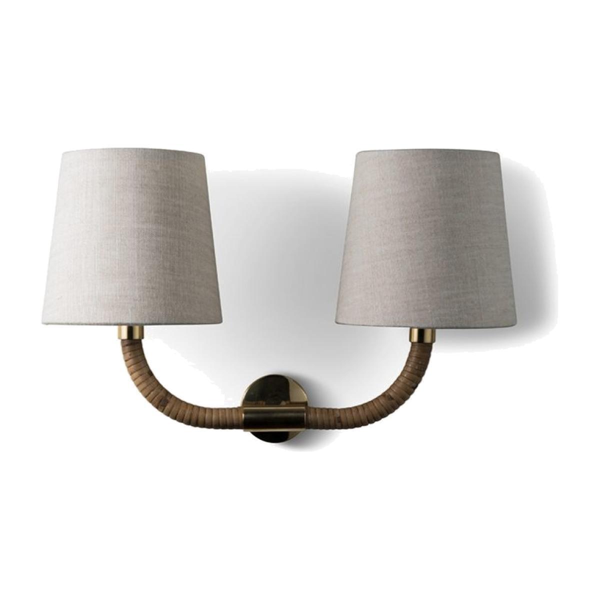 Part of the Holden family, this wall light has two arms, both wrapped in cane and finished with brass detailing. Much like the accompanying desk lamp, mirror and ceiling light, the Holden wall light has a refined and natural appearance.