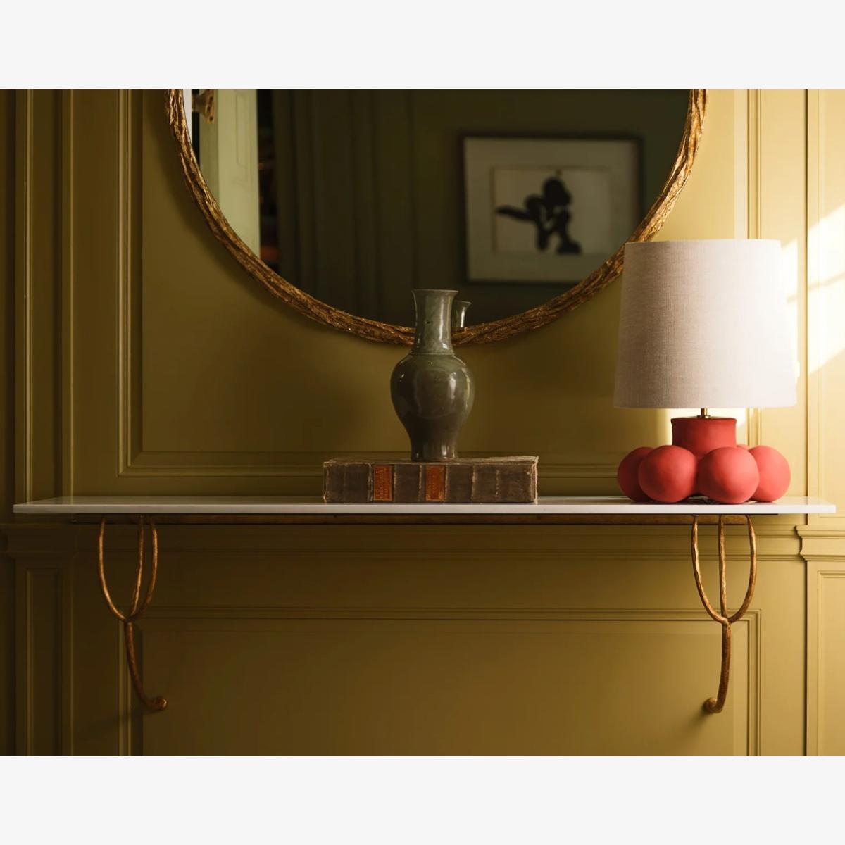 Decorative and characterful, the Logan Wall Mount console extends from the wall as a unique sculptural feature. Supported on delicate golden tridents, this piece boasts dexterity in design whilst retaining a simple and sophisticated edge. Many Porta Romana pieces are fully customisable. Products can be scaled up or down, proportions can be changed, and designs can be painted to your choice. Please contact us for options and best pricing.