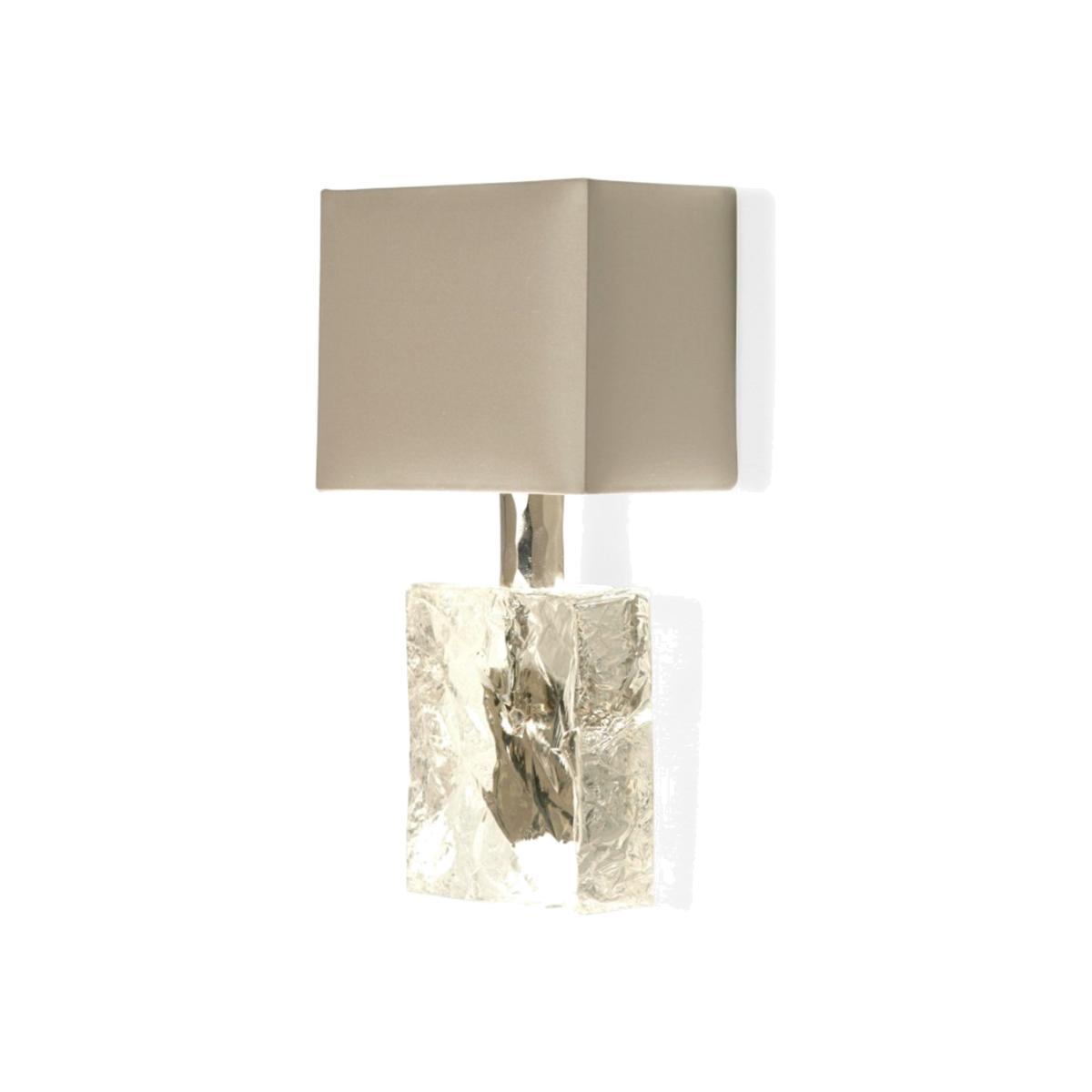 A simple glowing block of Perspex suspended from a chic nickel collar. The shade can be given a clear laminate lining if a higher degree of light is required. Shown with Nickel collar and Dove shade. Suitable for bathrooms.