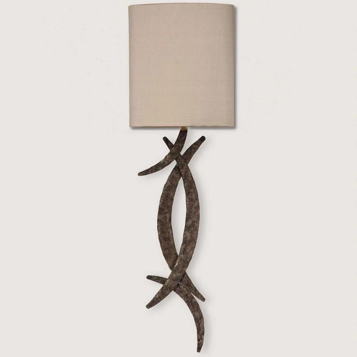 The Wall Light member of the Miro family retains the hand forged elements found in the Table Lamp and Chandelier, which have the same terrific impact as the bold and graphic shapes so often found in the work of the Spanish artist. Burnt Silver shown with 12" Open Back Miro in Putty Silk with Cream Card lining. Many Porta Romana pieces are fully customisable. Products can be scaled up or down, proportions can be changed, and designs can be painted to your choice. Please contact us for options and best pricing.