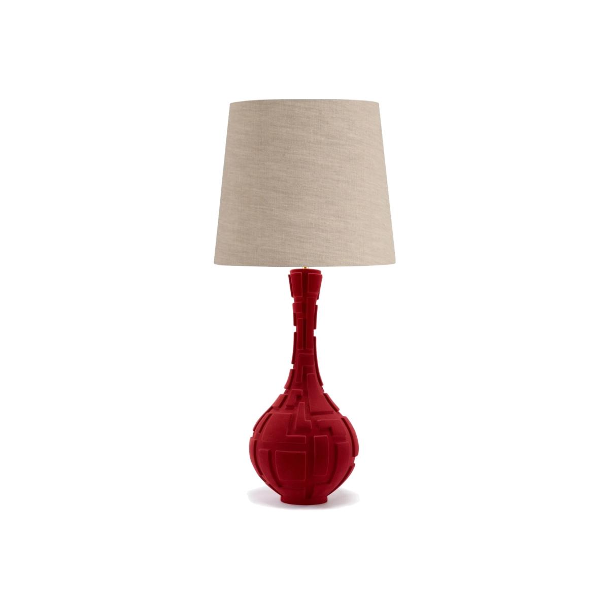 An elegant form with generous proportions the feminine curves of this lamp are enhanced with a contrasting complex raised pattern of interlocking squares finished in a velvety flock or hand-painted in Flint White Flint Bronze or Aged Plaster.