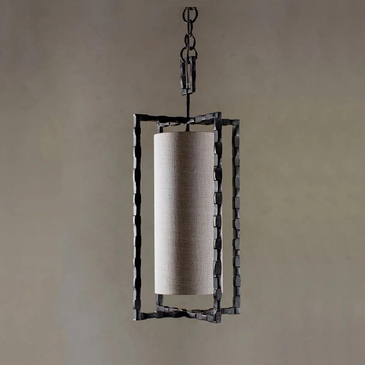 The Small Giacometti Pendant is formed of two interlinking frames, each textured with geometric grooves that characterise Porta Romana’s Giacometti pieces. This design can be custom sized. Carbon shown with 5" Tall Cylinder in Natural Linen with Cream Card lining. Many Porta Romana pieces are fully customisable. Products can be scaled up or down, proportions can be changed, and designs can be painted to your choice. Please contact us for options and best pricing.