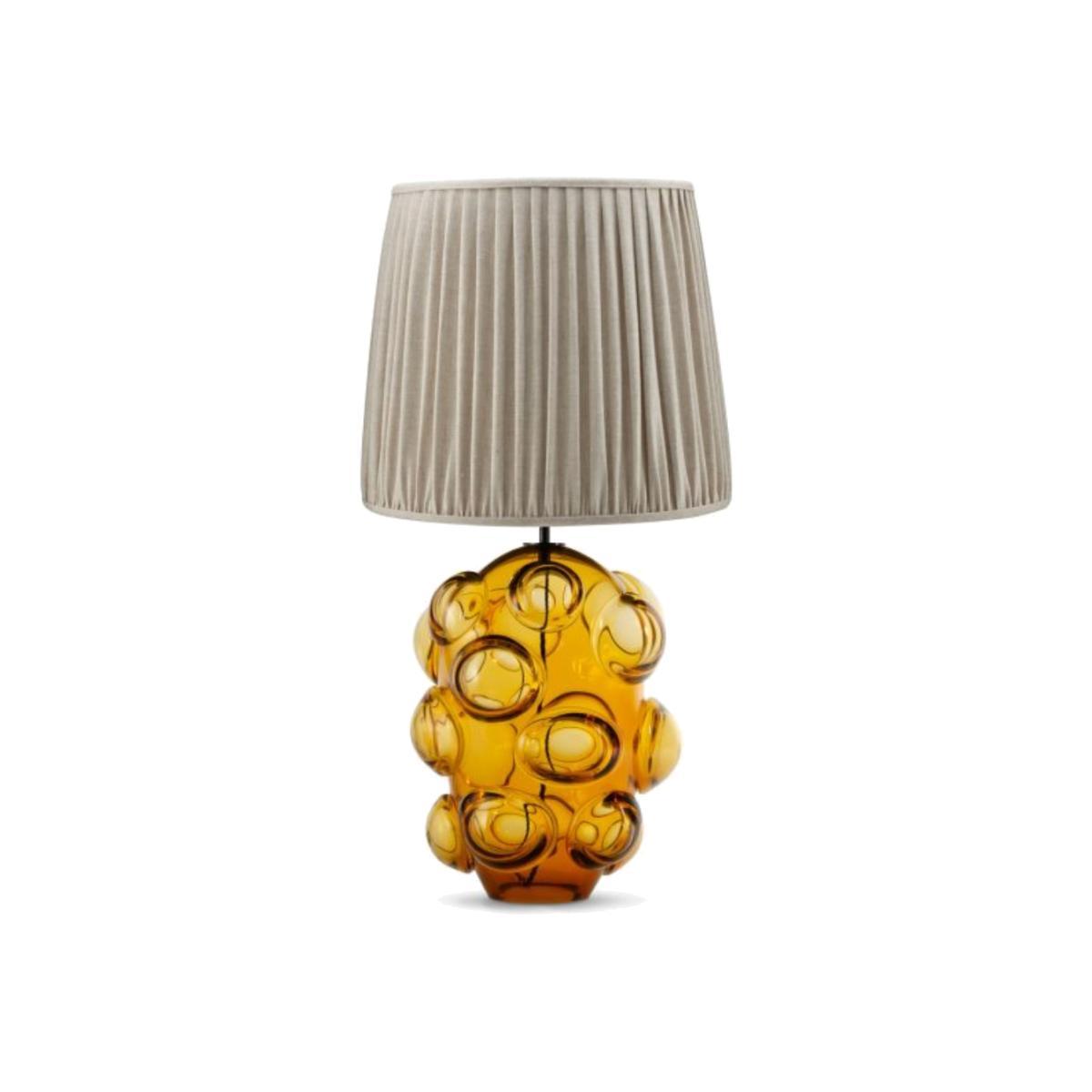 I love this lamp for its bold, sculptural presence and warm amber hue that adds a touch of colour without overpowering a space. It works particularly well in eclectic or modern interiors, where its distinctive bubble base can serve as a statement piece. Practical styling tips include pairing it with neutral textiles and minimal accessories to let its unique form shine, or placing it on a bedside table or sideboard to balance its visual weight. Its warm glow also makes it ideal for creating cosy atmospheres in living rooms and bedrooms. Overall, it’s a versatile piece that combines function with artistic flair, perfect for adding personality to various interiors.