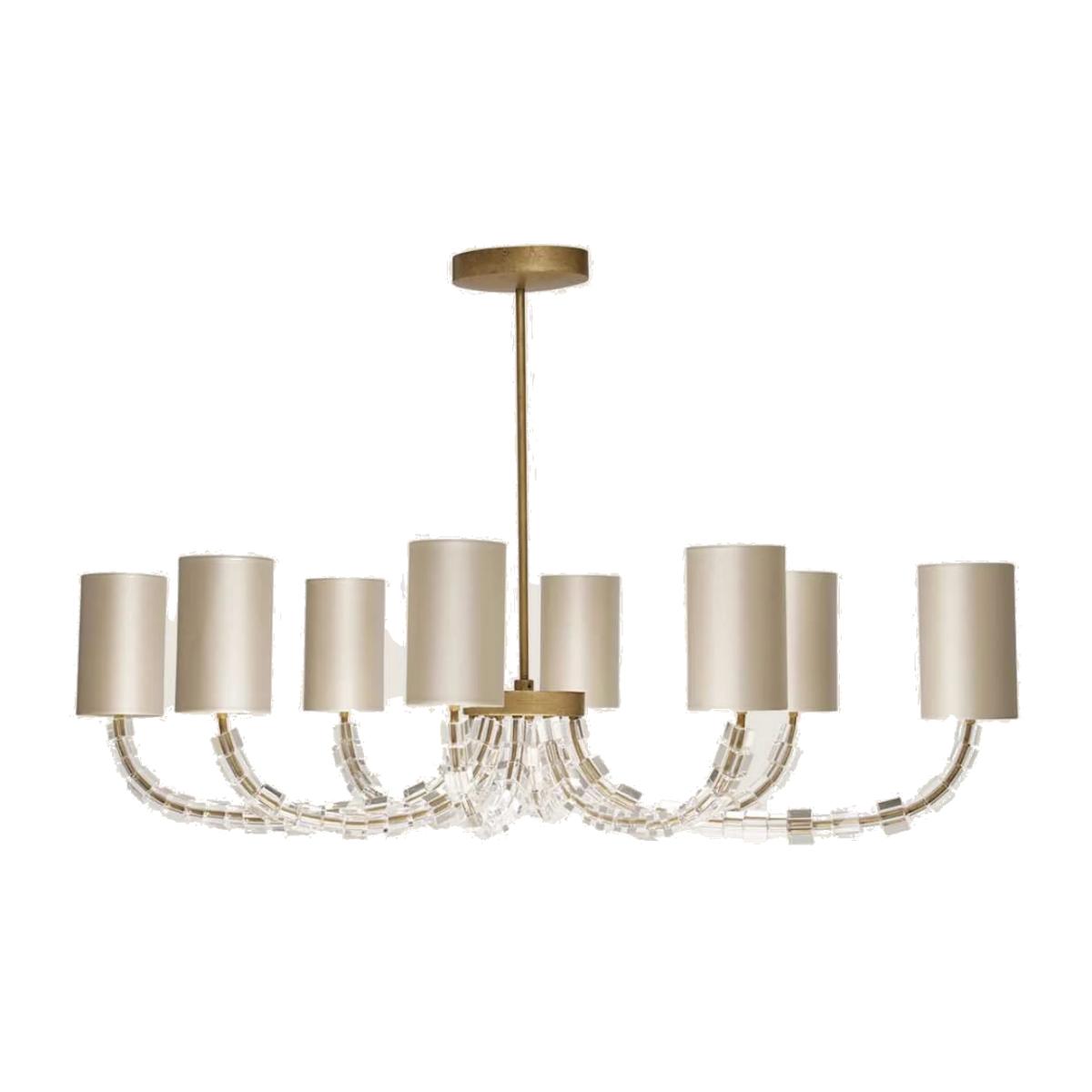The Oval Lartigue features hundreds of cast crystal cubes that catch the light and illuminate the arms of the Chandelier. Clear Crystal with French Brass shown with 4" Dove Satin shades with Cream Card lining. Many Porta Romana pieces are fully customisable. Products can be scaled up or down, proportions can be changed, and designs can be painted to your choice. Please contact us for options and best pricing. For all orders going to the US, an 85% UL surcharge will be applied to account for US wiring requirements.