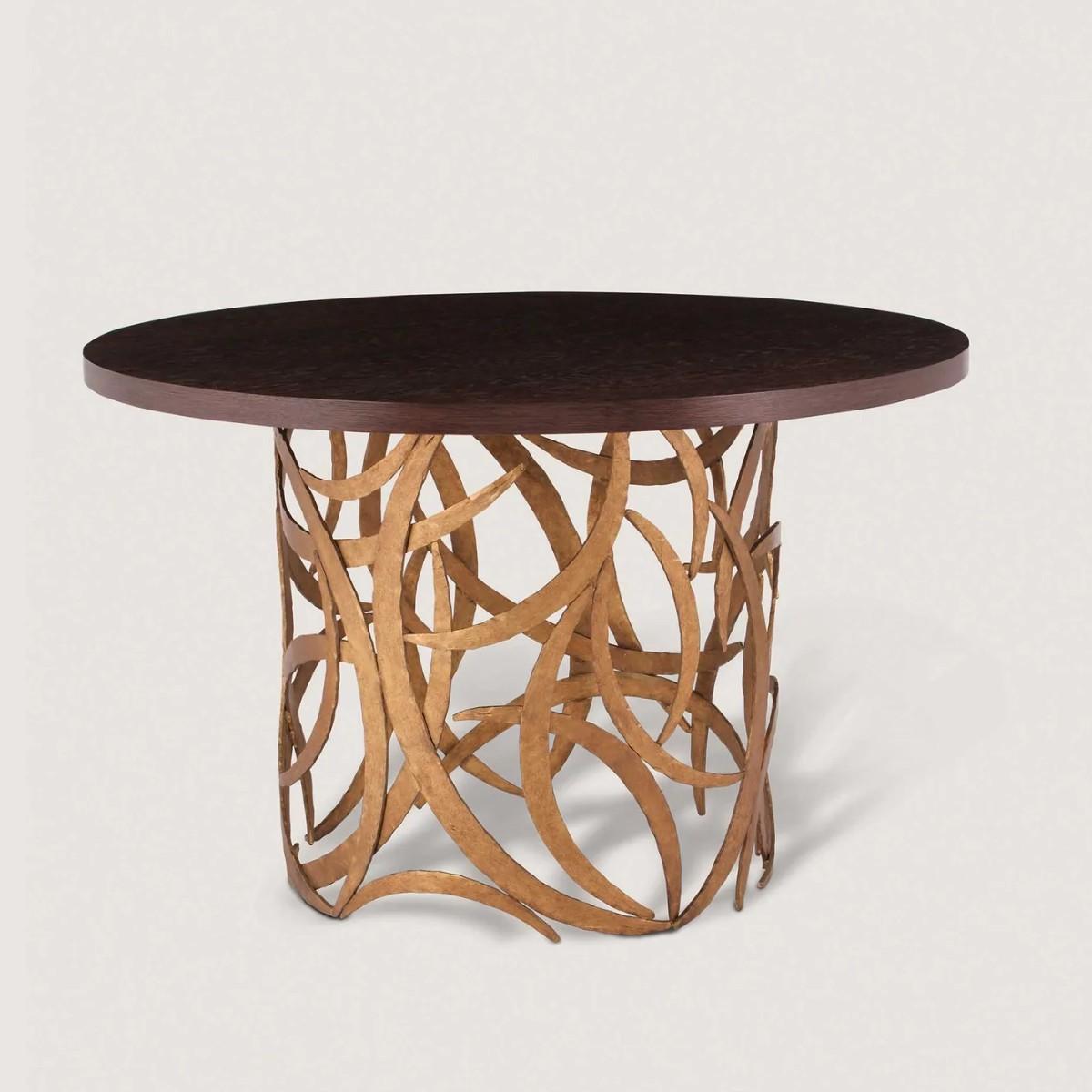 The Miro Centre Table demonstrates the skill of Porta Romana’s metalworkers, as hammered ellipses have been layered, curved and welded together to form a circular table. Available with any wooden, glass or marble top and can be custom sized. French Brass with Dark Fumed Oak Top shown. Many Porta Romana pieces are fully customisable. Products can be scaled up or down, proportions can be changed, and designs can be painted to your choice. Please contact us for options and best pricing.