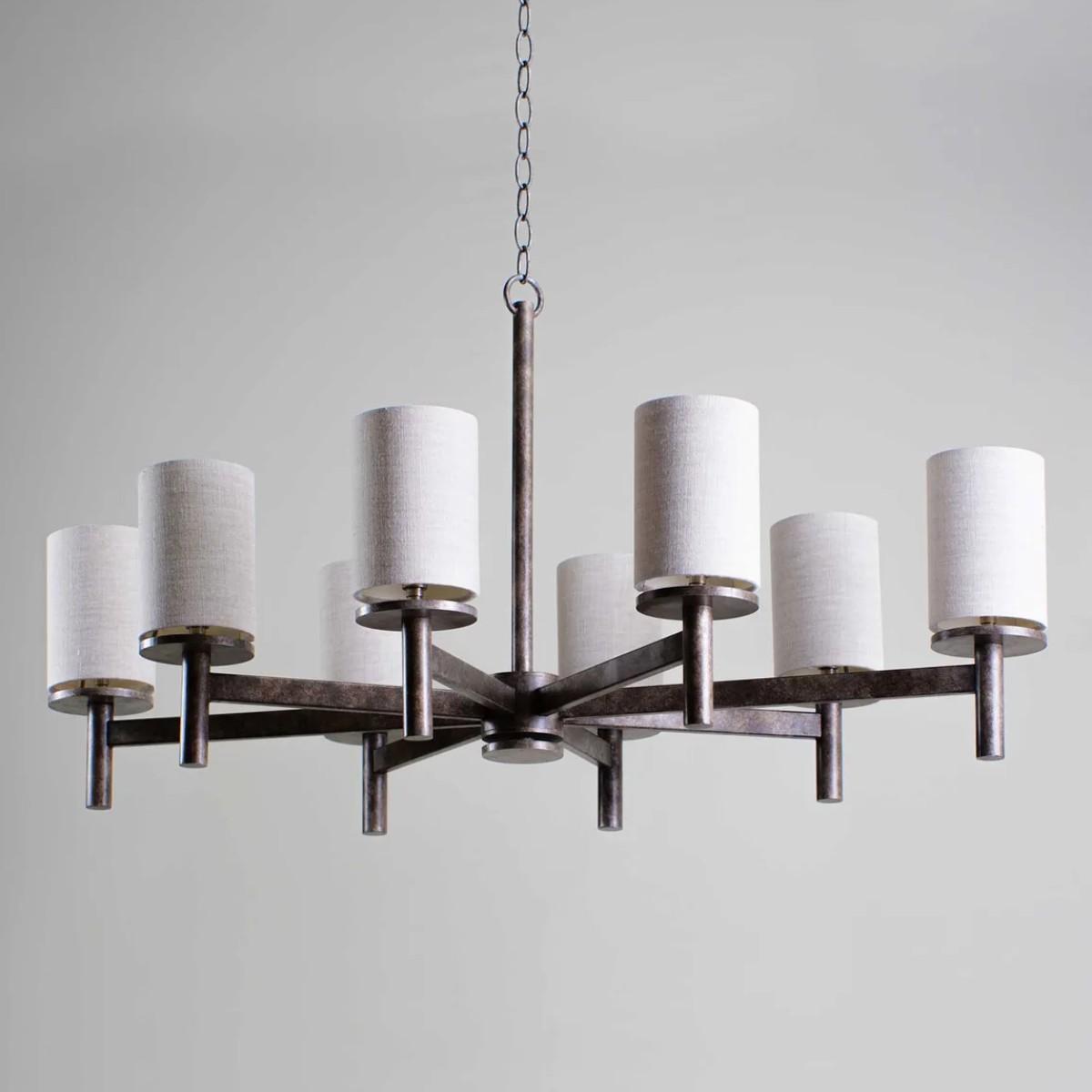 The linear struts of the Neptune Chandelier are symmetrically placed to provide an even distribution of light. The Small Neptune was designed for more intimate spaces with limited headroom. This design can be custom sized. Burnt Silver shown with 4" Cylinder in Natural Linen with Cream Card lining. Many Porta Romana pieces are fully customisable. Products can be scaled up or down, proportions can be changed, and designs can be painted to your choice. Please contact us for options and best pricing.