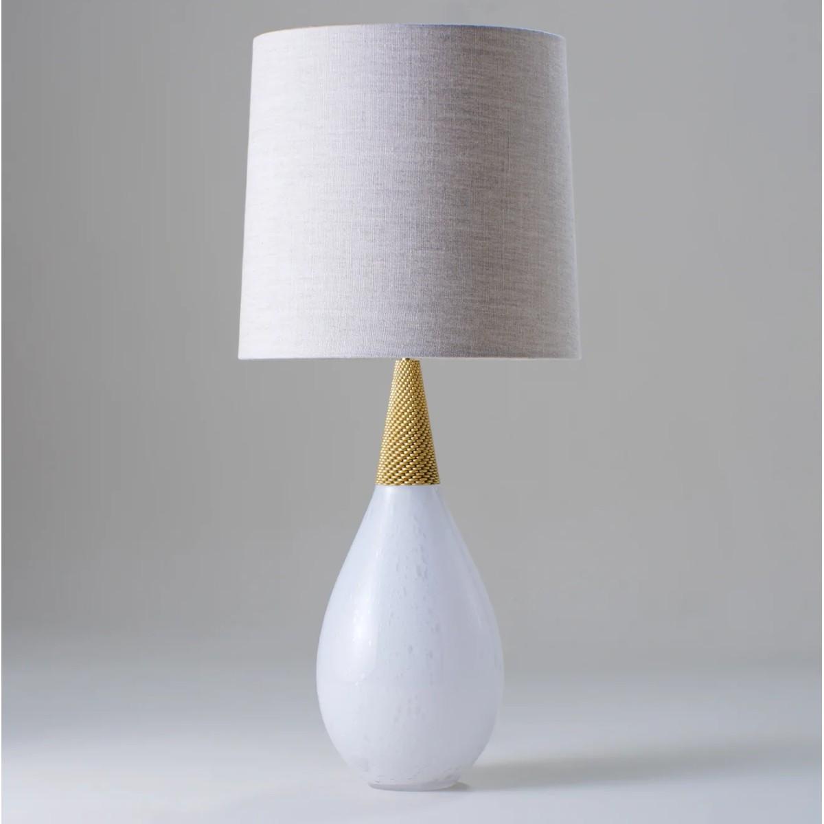 To achieve the smooth drop shape of the Pearldrop Lamp, the glass has been mould-blown. The piece is made in bubbled milk glass, creating a luxurious opaque finish and paired with a collar painted in our workshop. Shown with 12" Fez in Natural Linen with Cream Card lining. Many Porta Romana pieces are fully customisable. Products can be scaled up or down, proportions can be changed, and designs can be painted to your choice. Please contact us for options and best pricing.