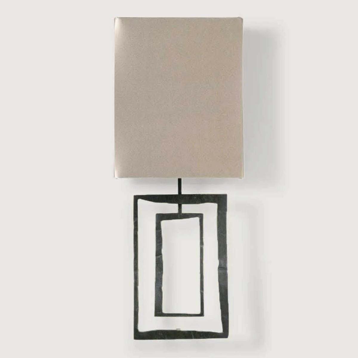 The Salpertini Wall Light is part of the Salperton family, characterised by their geometric formed and uneven metal bars. Bronzed shown with 6" Open Back Rectangle in Putty Silk with Cream Card lining. Many Porta Romana pieces are fully customisable. Products can be scaled up or down, proportions can be changed, and designs can be painted to your choice. Please contact us for options and best pricing.