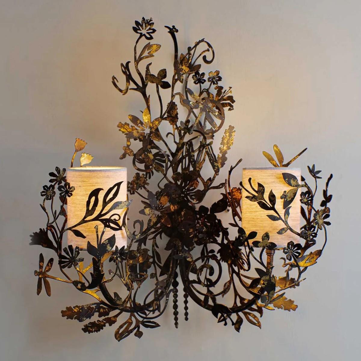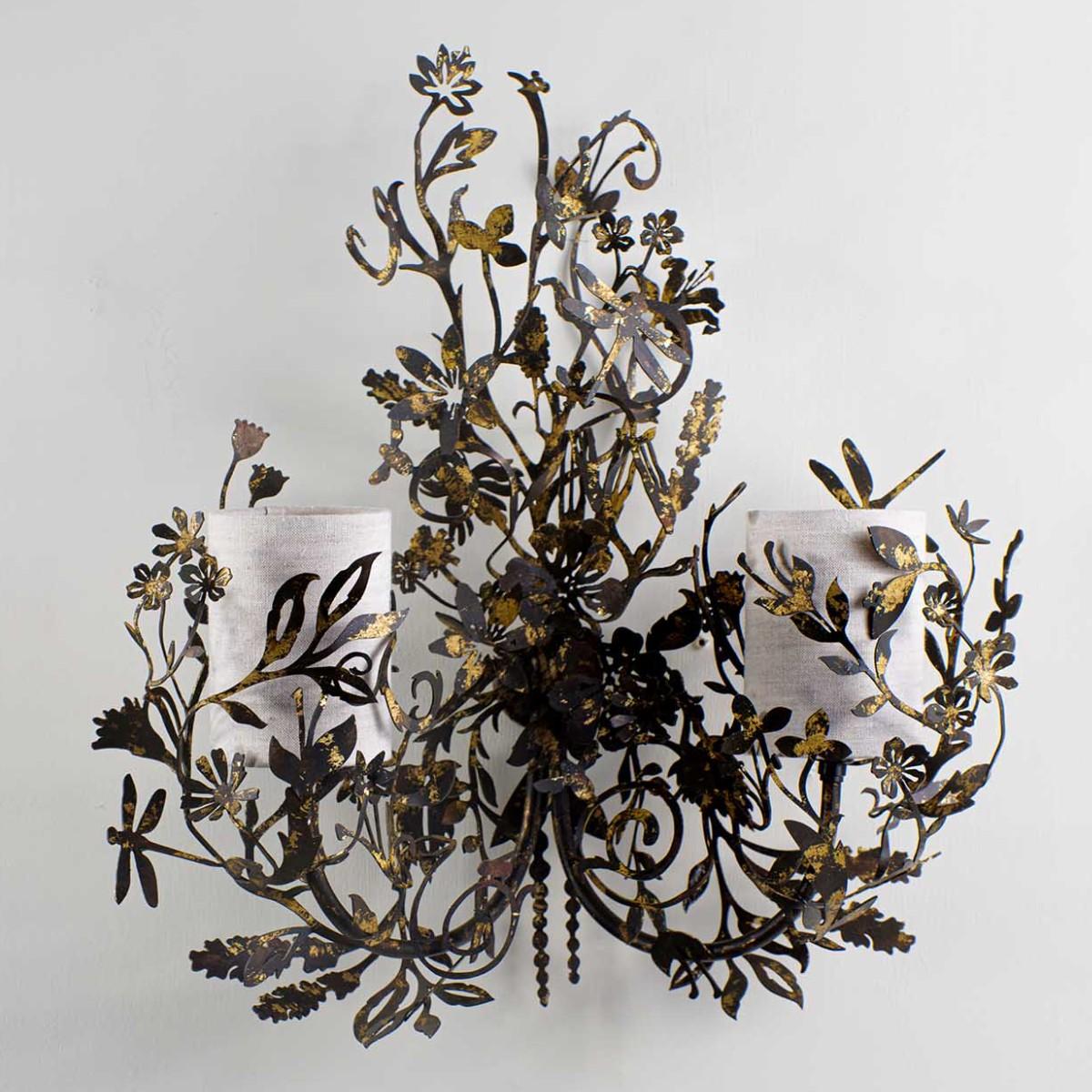 The design of The Spry Wall Light is based on elements of dried plants and flower heads. Created from laser-cut aluminium and a hand-formed metal frame, the Spry is also available in a smaller model. Gilded Rust shown with 2 x 3. 5" Top Hats in Natural Linen with Cream Card lining. Many Porta Romana pieces are fully customisable. Products can be scaled up or down, proportions can be changed, and designs can be painted to your choice. Please contact us for options and best pricing.