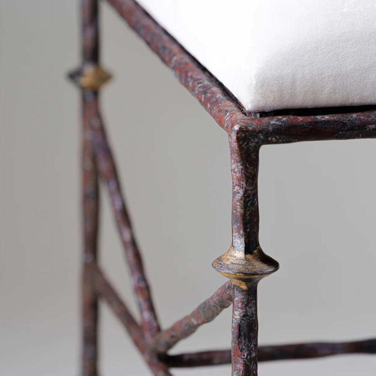 Characterised by a hand-beaten texture and distinctive conical-shaped feet, the Stanley dressing table bench is inspired by the furniture designs of Diego Giacometti and can be custom made in any size or painted finish of your choice. Shown here in Old Rust with Gold. Matching dressing table and mirror available. Many Porta Romana pieces are fully customisable. Products can be scaled up or down, proportions can be changed, and designs can be painted to your choice. Please contact us for options and best pricing.