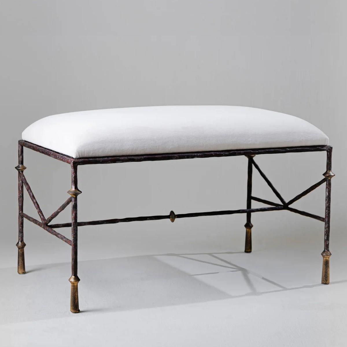 I love the vintage yet refined look of the Porta Romana bench - it’s a versatile piece that adds character to both classic and contemporary interiors. Its slender metal frame offers a lightweight feel, making it perfect for bedroom dressing areas or at the foot of a bed. In terms of styling, it works well with monochrome palettes or layered textures, serving as a comfortable seating option or a stylish surface for accessories and decor. To maximise its impact, consider pairing it with plush cushions or a cosy throw, and position it near statement lighting or a statement mirror to enhance its visual appeal.