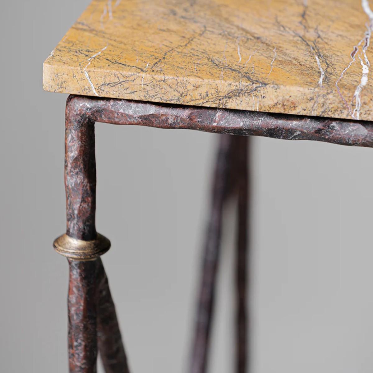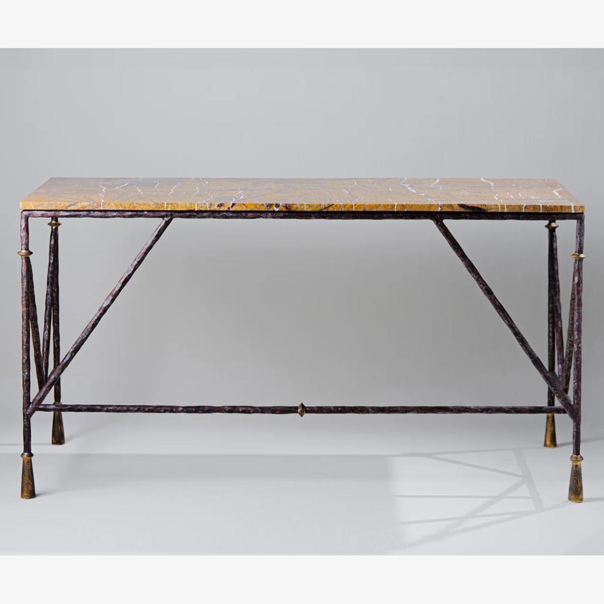 Characterised by a hand-beaten texture and distinctive conical-shaped feet, the Stanley dressing table is inspired by the furniture designs of Diego Giacometti and can be custom made in any size or painted finish of your choice. Shown here in Old Rust with Gold, and Rainforest Gold top. Also available with a matching dressing table mirror. Many Porta Romana pieces are fully customisable. Products can be scaled up or down, proportions can be changed, and designs can be painted to your choice. Please contact us for options and best pricing.