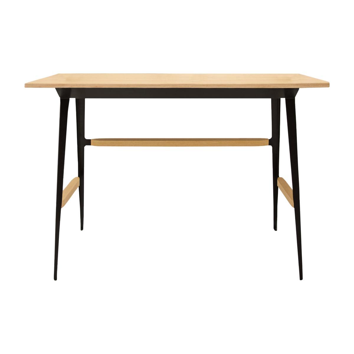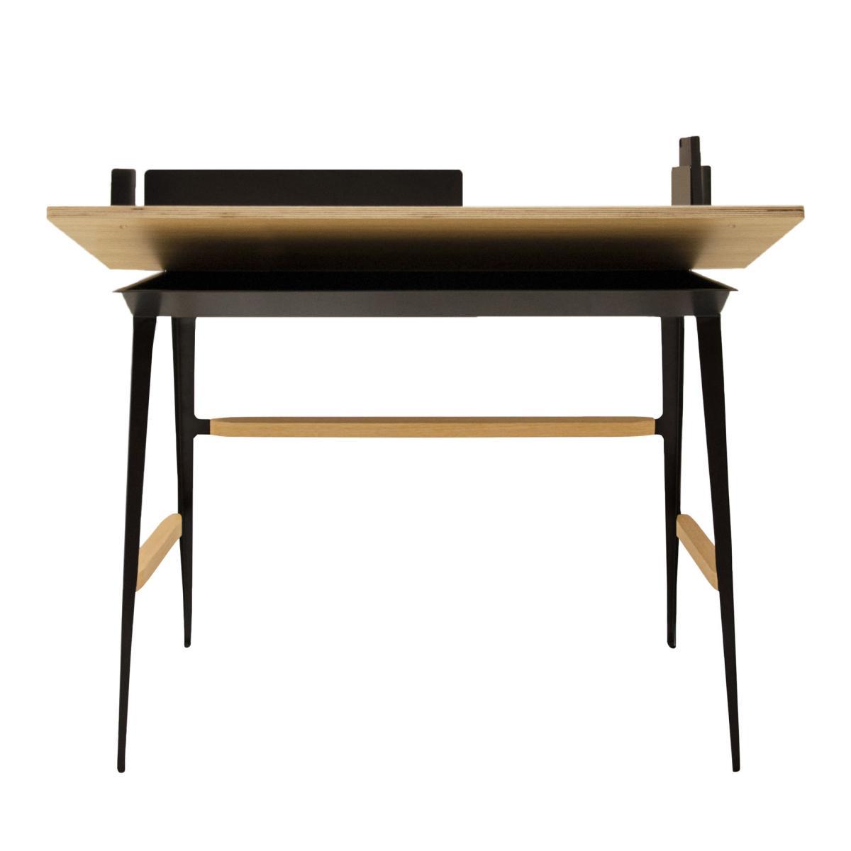 Philippe Nigro designed a desk with a light look: a top in birch plywood with oak finishing with a flap door opening style sets on a structure in steel sheet painted in matt black with details in oak. Its small size and linear design make this elegant desk perfect for use in different places, in an office, or as a console in a living room or bedroom. An accessory kit is available - which contains a side panel, front panel, and sliding element for paper - to allow the desk to be personalised and emphasise the image of a collected personal space.