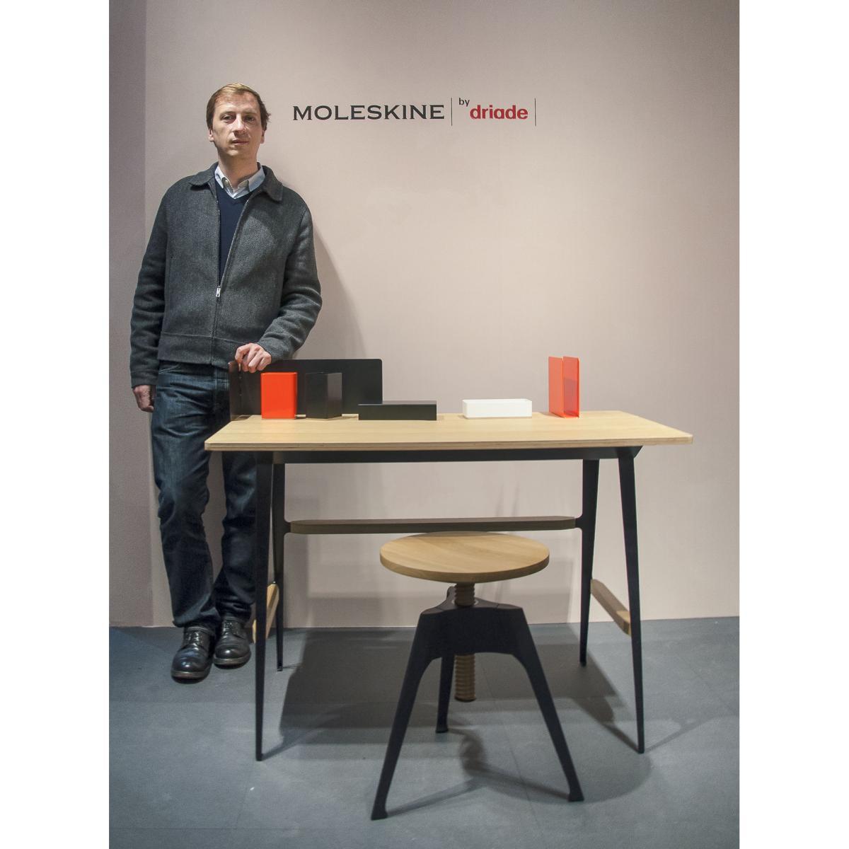 In the collection's ‘nomadic' spirit, the stool functions well in any room in the house, although it was designed to be used with the desk. Height-adjustable with a round oak seat set on a tripod structure in aluminium sheet painted black, this stool has a playful linear design that matches the base of the desk.