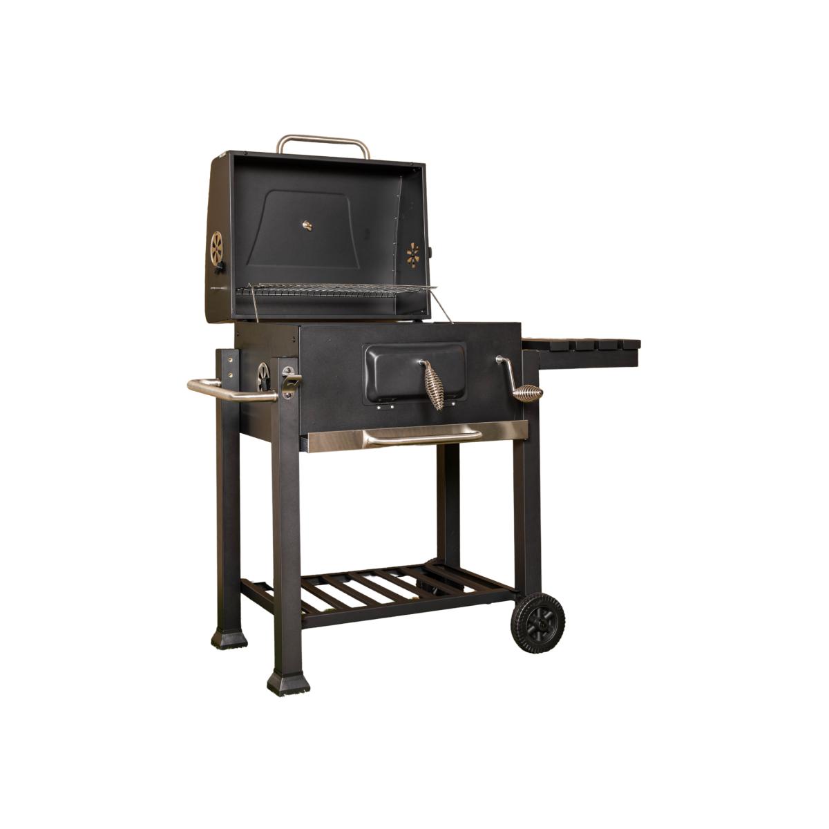 Elevate your BBQ experience this year with this Samuel Alexander portable black BBQ trolley on wheels. Having a BBQ brings a focal point to your garden or patio area for summer get togethers with family and friends, the perfect addition to any outdoor space this summer. This stylish design meets durability with a black steel frame structure and 2 wheels for easy manoeuvrability. WIth a large cooking area, a warming rack and a large heating area, this BBQ offers plenty of storage space with the folding side shelf, the lower rack for charcoal or food storage and 4 side hooks to hang cooking tools or towels to keep all your grilling essentials within easy reach. Using the crank handle, the height of the charcoal can be adjusted to provide the best heat distribution and makes it easy to control the smoky flavors. Featuring a thermometer gauge on the lid to help give an accurate temperature of the grill and side air vents to adjust the heat and stabilise the coal temperatures whilst aiding to create the smoky flavour. With a bottle opener to attach to the front of the grill to complete your BBQ experience. When not in use the BBQ is supplied with a durable black cover to protect the BBQ and extend the longevity with it's waterproof and heavy duty construction. Supplied flat packed and self assembly is required with instructions included.
