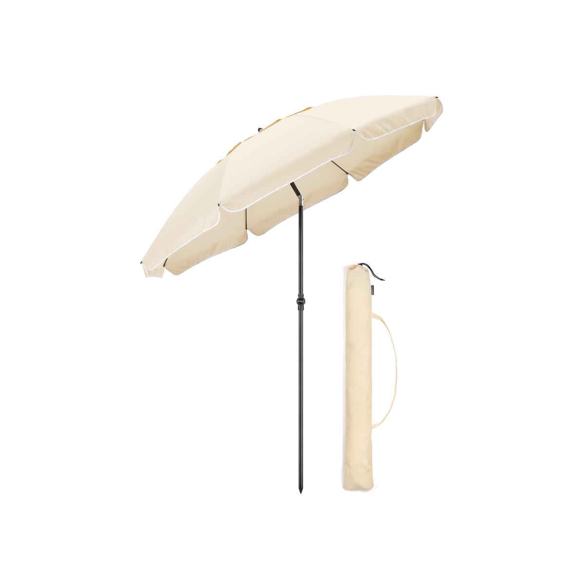 Shield yourself from the sun with our portable parasol. Available in a range of contemporary colours, it features fringed sides and contrasting trim for a stylish, retro look. Its perfect for shading you in your garden, down the beach, or wherever your summer adventure takes you. The parasols canopy is made from durable 180g polyester material which is rated UV 30 to provide ultimate protection from the suns damaging ultraviolet rays. It has a diameter of 2-metres on the outside and delivers 1.8-metres of shade when youre relaxing beneath it. No matter where the sun is in the sky, our parasol will always keep you shaded. A push button allows you to tilt the canopy left or right to easily block out glare from the low-lying sun. The fringed sides provide additional shade whilst giving the canopy a classic beach umbrella look.