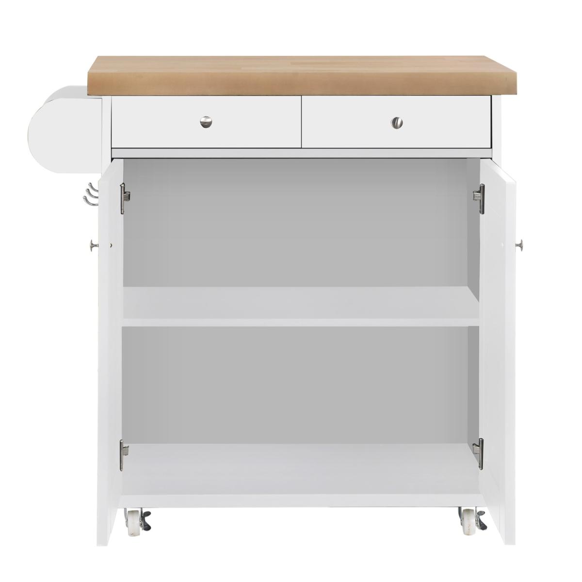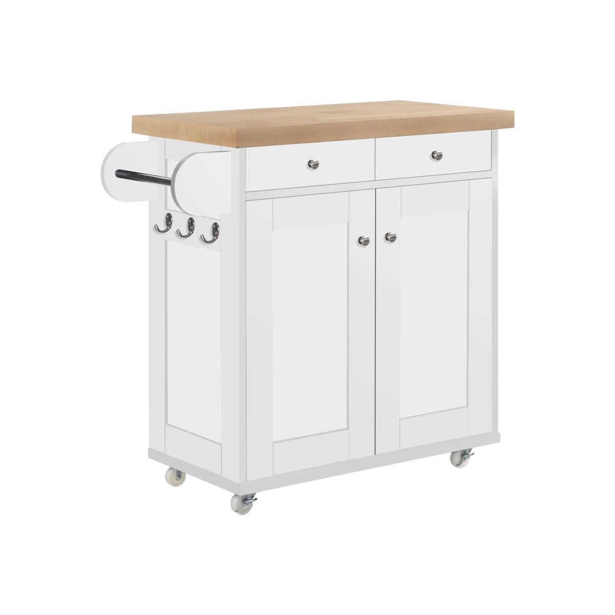 Features we love Sits upon wheels for easy movement in the kitchen Discreet storage with double door cupboard with internal shelf2 Drawers come in handy for easy access to essentials. Side mounted kitchen towel holder gives quick and easy access3 Handy hooks mounted on the side come in ideal for tea towels. Topped with a durable oak worktop All about me. Bring a whole new look to your kitchen with this two tone Portland kitchen island. It has a stylish base made from MDF with a matt white painted finish which is complimented beautifully by the contrasting oak top and flashes of chrome from the hardware. The oak top not only adds a touch of farmhouse styling it's also highly durable for the perfect workspace in the kitchen. This handy cart not only brings style to the kitchen it's also super functional. It's loaded with storage and handy features to make kitchen life a little easier. There's a double door cupboard with an internal shelf providing plenty of discreet storage space for appliances or even food supplies. There's also two neat drawers below the worktop which come in great for quick access to essentials like your potato peeler and knife set. Mounted on the side of this kitchen unit is a nifty bar which is perfect to hold your kitchen towels or oven mitts giving you quick and easy access to it whenever. There's also three handy hooks mounted just below ideal for tea towels or even pans and utensils. To finish off this neat kitchen island sits upon wheels so you can easily manoeuvre it around the kitchen to wherever you may need it. Need to know. Dimensions. H92.5 x W70 x D46 cm Each drawer. H7.0 x W30.5 x D32 cm Each shelf. H32 x D73.8 x W35.8 cm Material. Oak top and; MDF frame Finish. Matt white Assembly required. Yes.