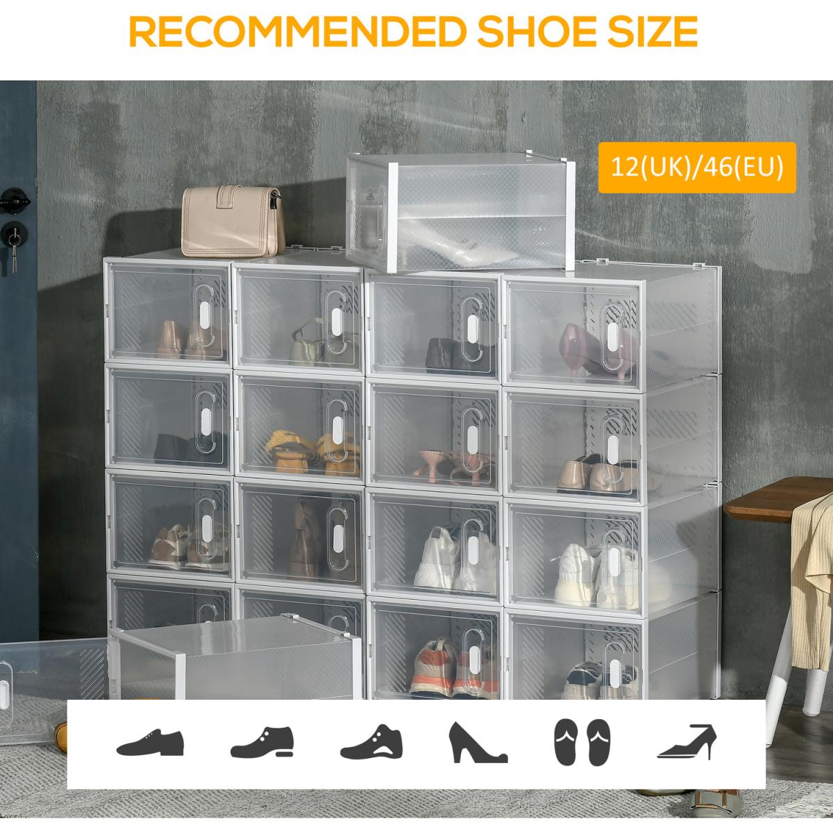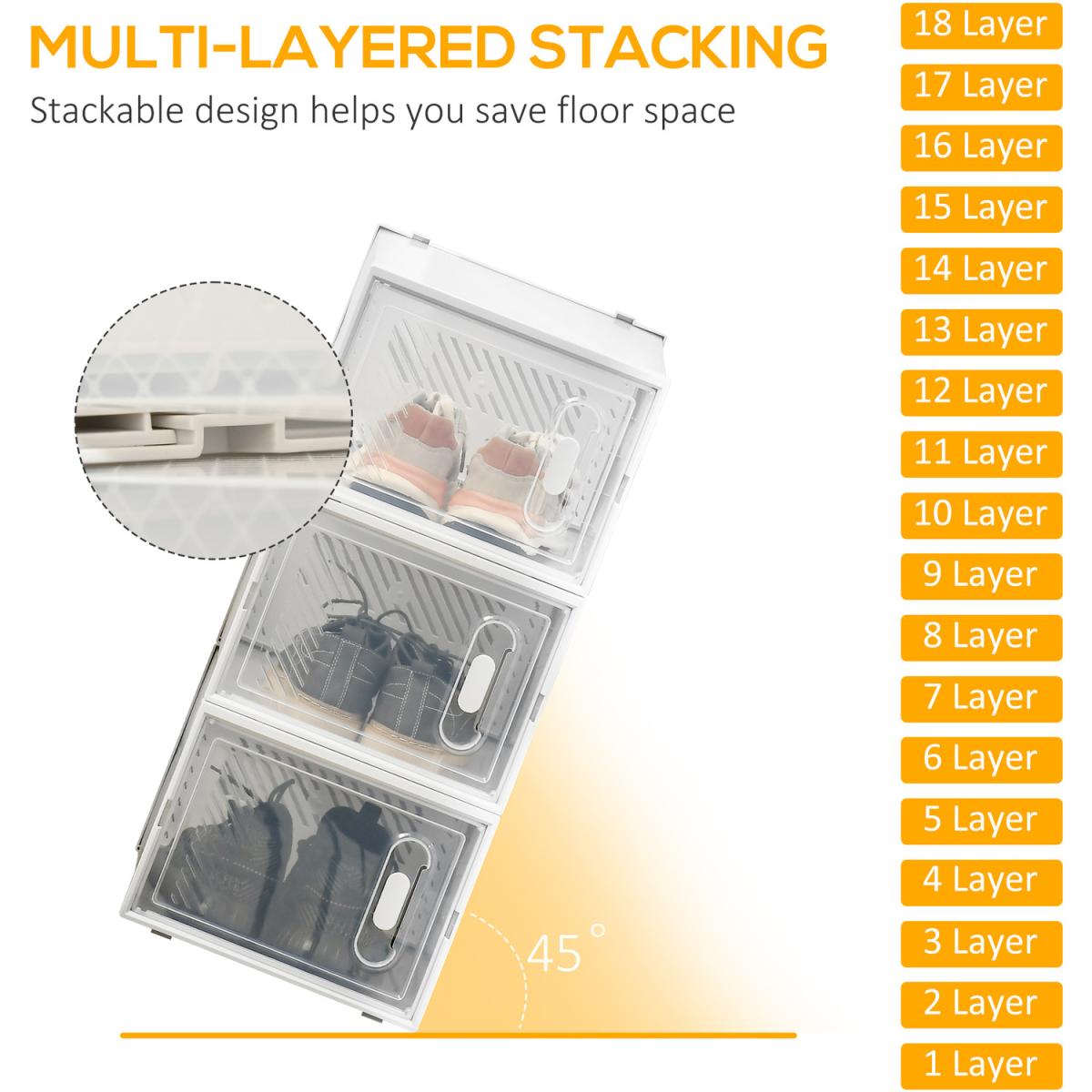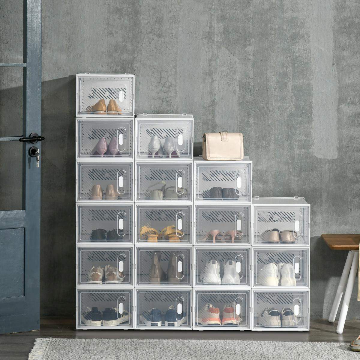 Are you tired of shoes on display and in the closet without any boxes and collecting dust? This clear shoe box from HOMCOM made into a customisable design, 18 cubes that can be set up in any way you wish, a cutout design on top securely stack one box on top of another, making it ideal for fitting into any size and shape space hassle-free. With clear plastic sheets, you can find items quickly. A great piece to your house!