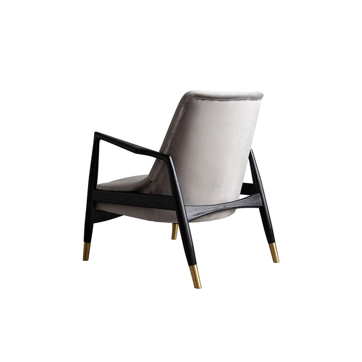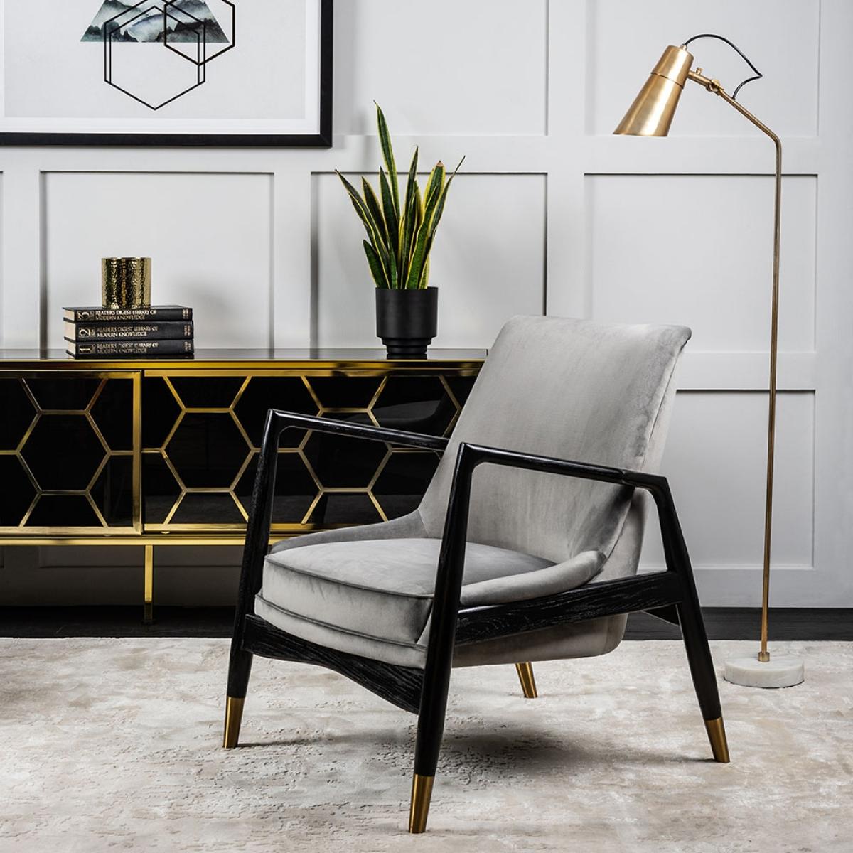 A striking, sculptural armchair inspired by 1960’s Californian interiors. Solid ash frame with very dark brown matt finish. Handsome and practical brushed brass foot caps. Comfortable padded and sprung seat. Velvet upholstery fabric.