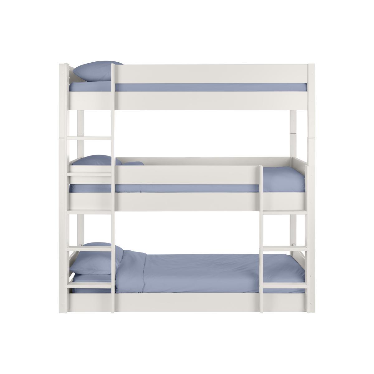 Ultimately space-saving, the Porter triple bunk bed is solidly constructed and strong enough to sleep three adults. Taking up no more room than one single bed, it’s perfect for children’s bedrooms or for a small spare bedroom if you often have a crowd to stay. Two ladders allow easy access to the upper bunks. The Porter triple bunk bed is a Furniture Village online exclusive, and comes in a choice of three on trend colours, dove grey, surf white and anthracite. The Porter triple bunk bed takes up the same space as a single bed. Strong enough to sleep three children or even adults, this sturdily constructed bunk bed maximises floor space in smaller rooms. This item is flat packed and will require self assembly. Mattresses shown are available separately. Why you'll love it. Make the most of your bedroom space, with three beds in one. Sleeps up to three children, or three adults. Solid, sturdy construction. Tough laminate finish in dove Grey, surf white or anthracite. Strong barriers to keep youngsters safe. Two ladders ensure safe access to upper beds. Meets British safety standards for children’s furniture. Great value for money. What you need to know. Fits standard UK single mattresses, not included. Heavy duty, made of solid pine and MDF. Sturdy wooden slats, each bunk can support the weight of an adult. Periodically check fittings have not become loose, legs must always be vertical and properly adjusted to support the mattresses.
