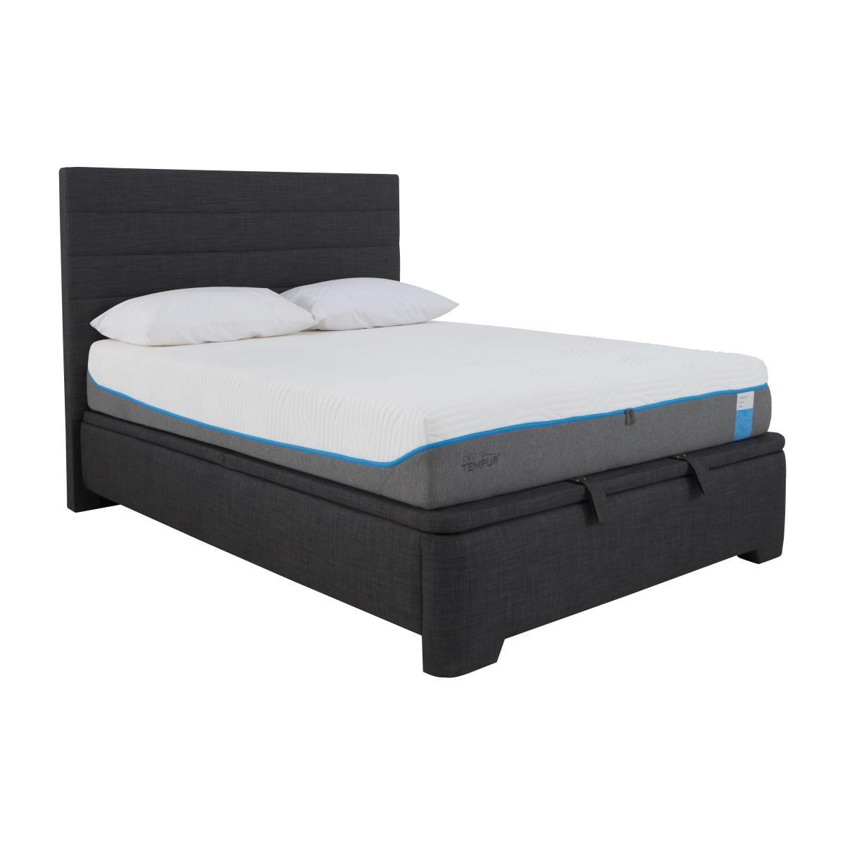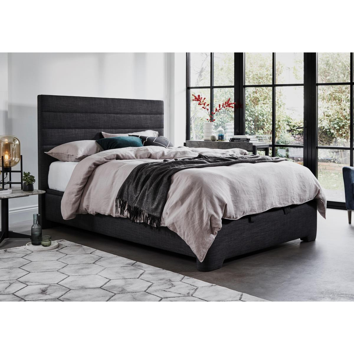 The Porthos Ottoman Bedframe makes bed buying easy. Its simple yet stylish design features roomy ottoman storage, a luxuriously cushioned headboard and a ventilated platform base for a cooler nights sleep. Why youll love it Stylish contemporary bed frame with spacious ottoman storage. Modern design with rounded edges and feet. Luxurious cushioned headboard with modern horizontal fluting detail. Hydraulic- assisted lift system for easy storage access. Platform style, ventilated base that keeps you cool and comfortable. Choose from chic grey or on- trend slate. Available in double, king and super king sizes. Made and hand- finished with care. What you need to know Upholstered in a soft polyester fabric. Mattress not included. Clean weekly using a soft brush or vacuum with the curtain attachment. Annual professional cleaning is recommended. Some fabrics can show wear on areas of more use or in direct sunlight.