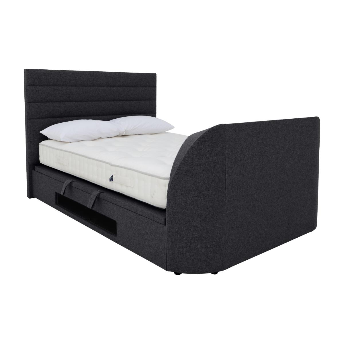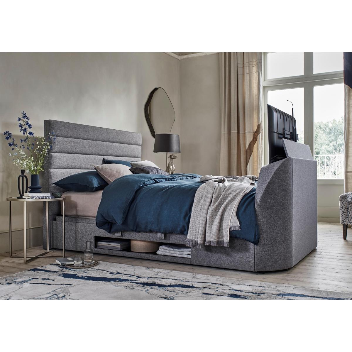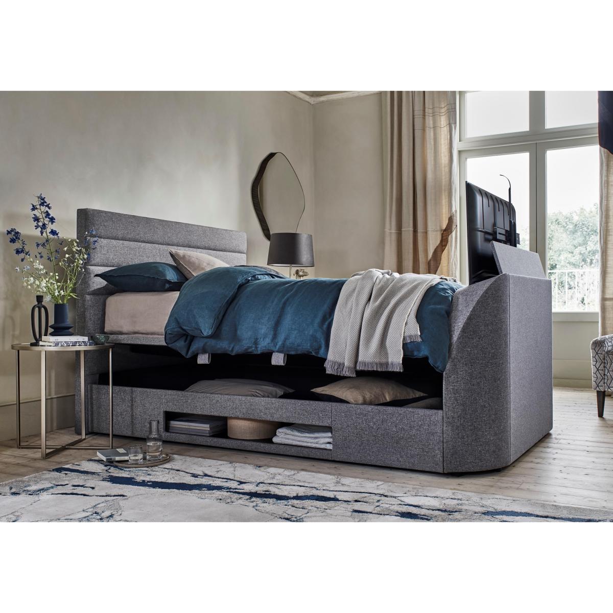 The Porthos Ottoman Bedframe makes looking for your perfect bed easy. Its 3-in-1 design comes with a luxuriously cushioned headboard, lots of storage space and a supportive platform base with ventilation for a cool and comfortable night’s sleep. Its hydraulic-assisted lift system makes it easy to access your storage while its modern, horizontally fluted headboard looks stunning in any bedroom. Its rounded edges and feet give it a contemporary feel. Available in stylish grey or chic slate. Made and hand-finished with care for Furniture Village. Modern elegance, luxury comfort – and TV bed functionality. This fabulous ottoman TV bed offers roomy storage and can accommodate a large TV that can be raised and lowered by remote control. Why you'll love it This contemporary TV ottoman bed frame makes it so easy to relax in style. Elegant modern design with built-in functionality. There’s space for up to a 43 inch TV in the foot end (TV not included). TV can be raised and lowered by remote control (supplied). Hydraulic-lift side-opening ottoman with roomy storage compartment. Cushioned headboard. Hand-finished upholstery with horizontal fluting, handmade frame. The small side storage and side ottoman opening can be on either side of the bed. In double, king and super king sizes. Only at Furniture Village. This TV ottoman bed frame is part of the Porthos range. What you need to know Mattress sold separately. TV not included. Please take care when opening and closing the ottoman. Clean regularly using a soft brush or vacuum with the curtain attachment. Deal with any spills promptly. Professional cleaning advised for oil- and grease-based stains. Some fabrics can show wear on areas of more use or in direct sunlight.