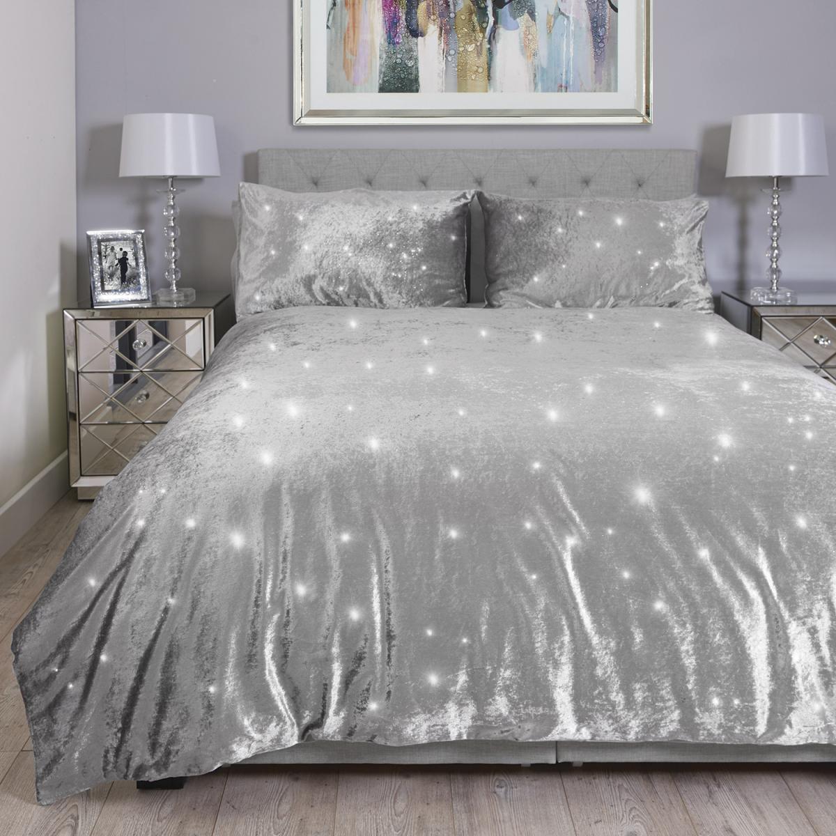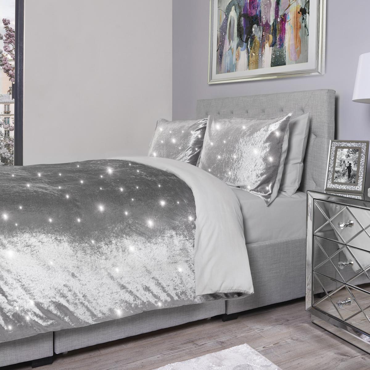 Featuring a luxurious velvet-effect cover and embellished sparkling glitter, the Portia Sparkle Duvet and Pillow Case is perfect for bringing a mass of glamour to any bedroom. The sleek colouring will complement almost any colour scheme, highlighting the class of your decor and adding some fun sparkle. With the reverse side made from a 50/50 polycotton blend, this duvet set will remain soft and breathable, so its as comfortable a place to sleep as it is luxurious.
