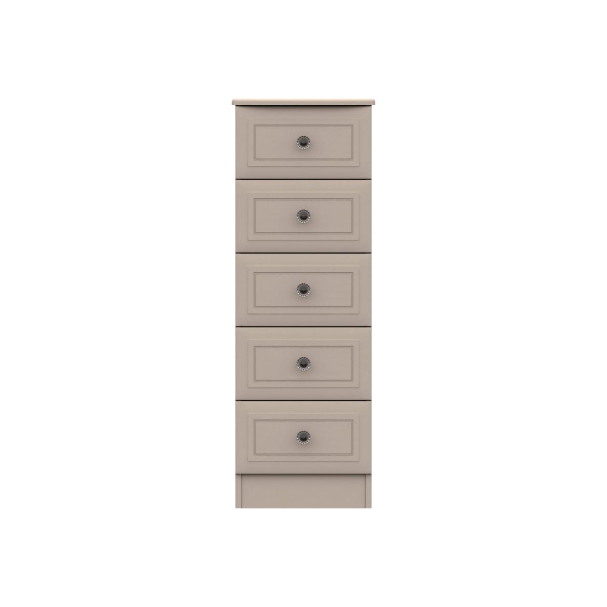 The Portia 5 Tall Chest of Drawers offers a stunning timeless design, perfect for enhancing any bedroom space. This stylish chest of drawers offers a traditional styling, with its elegant bevelled edge profile drawer fronts with beautiful crystal look handles. Supplied fully assembled for convenience, the Portia comes with five spacious drawers, complete with 8mm heavy duty bases, linen look insides and easy glide metal runners. Please note, unfortunately we can not deliver this item to the Channel Islands, Ireland, Isle of Wight, Isle of Man or the Scottish Islands.