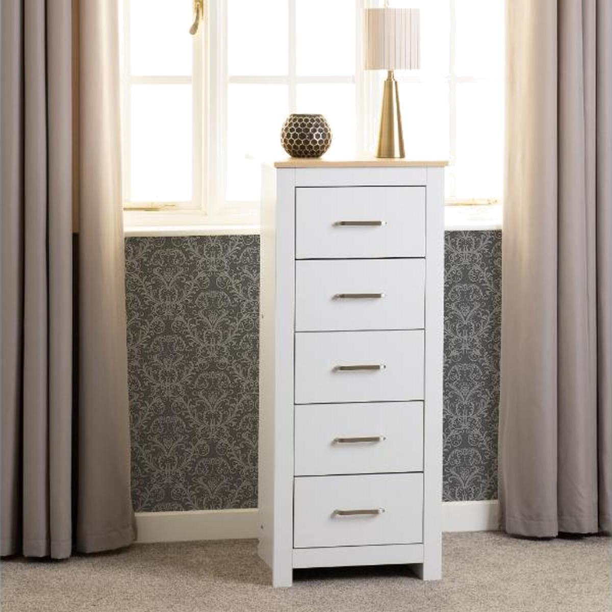 Explore modern functionality and elegance with our Portland 5-drawer narrow chest, a perfect fusion of contemporary design and practicality. Available in your choice of sophisticated white or sleek grey, each piece boasts stunning oak tops that exude timeless charm. The sleek silver hardware adds a touch of refinement while ensuring smooth functionality. With its slender profile, this chest maximizes space without compromising on storage. Organize your belongings effortlessly across five ample drawers, offering convenient storage solutions for various items. UK Mainland delivery only, between 9am - 9pm (weekdays) the courier will contact you on the day of delivery to offer a time slot. This takes place within 10 working days (Ground floor only). Please also ensure that we have a note of your up-to-date address and contact information, including daytime phone number and email address to be passed to the couriers.
