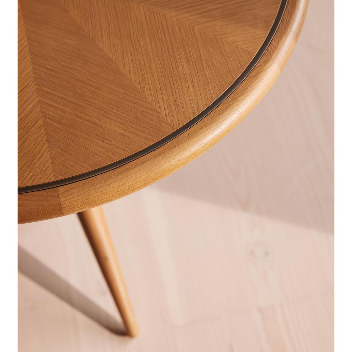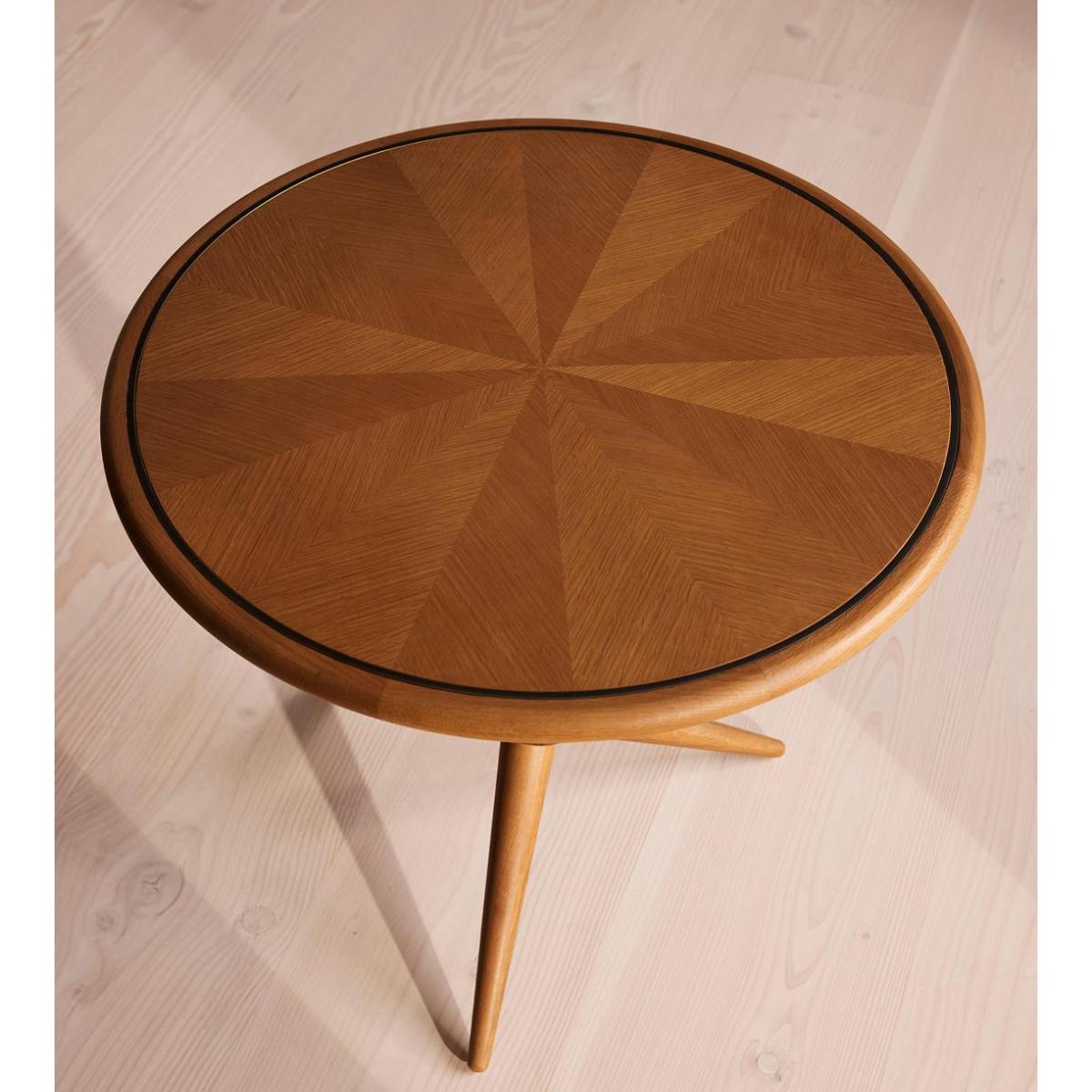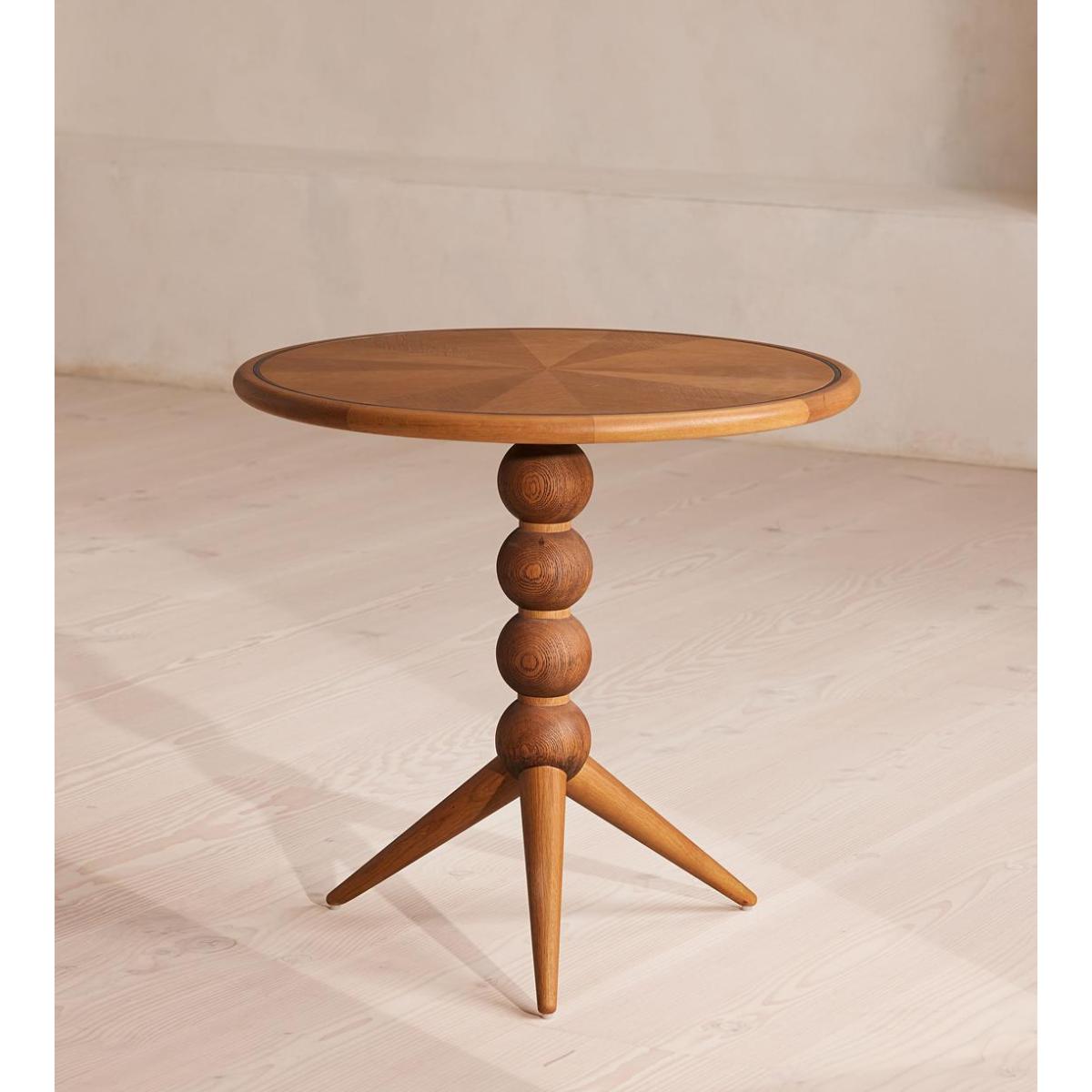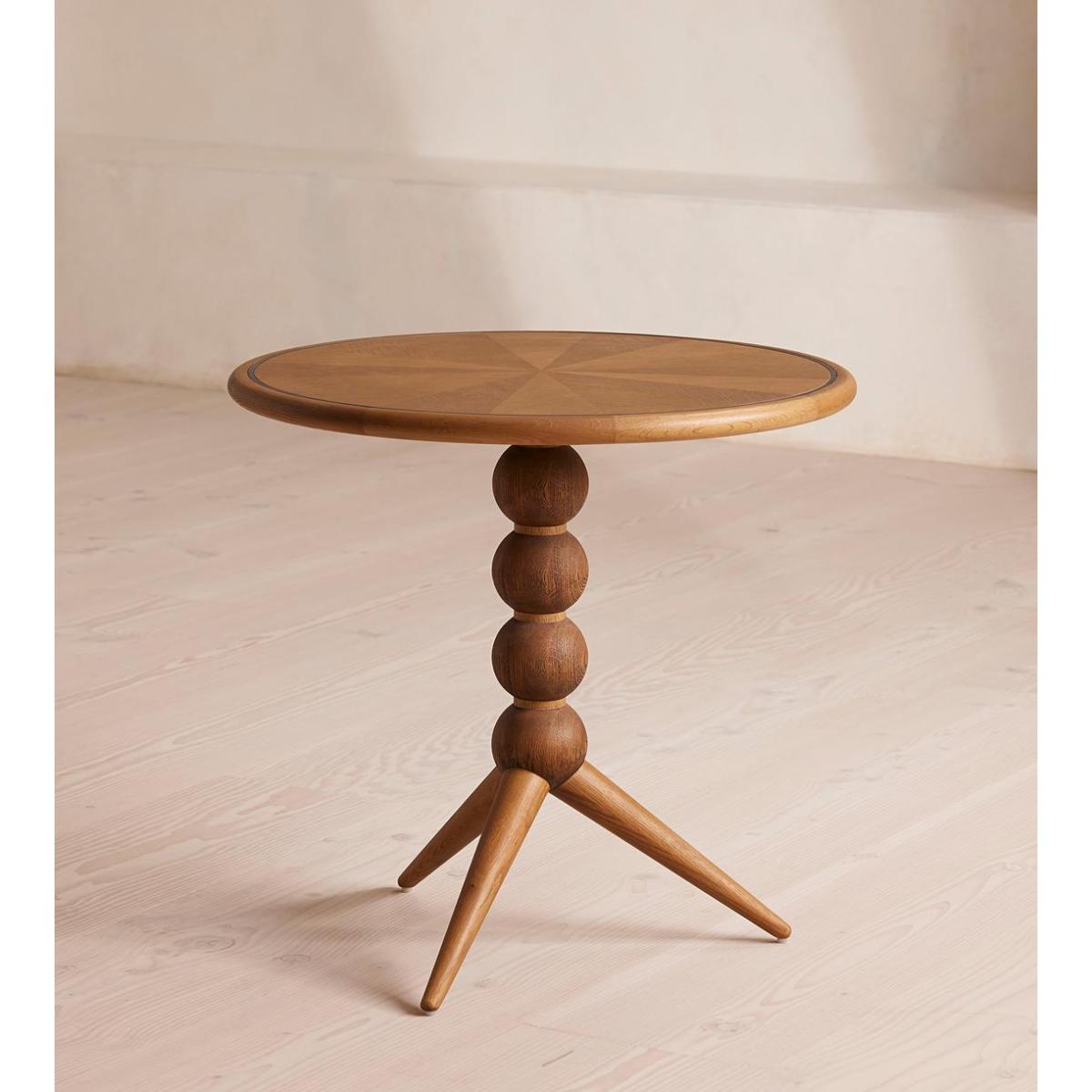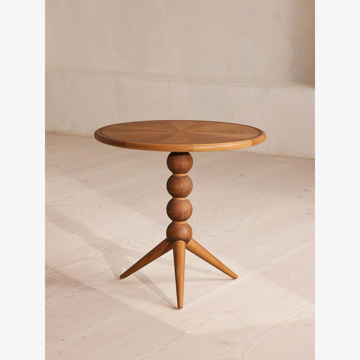 This small bistro table forms part of our capsule collection for Soho House Portland. Seating up to two people, a starburst veneer marquetry design on the top is complemented with a turned solid oak base. Finished with bronze inlay rings, this textural design with a mix of materials brings added interest to your interiors, while creating a space for intimate conversation and coffee. • Small bistro table • Limited-edition design • Part of the Portland capsule collection • Seats two people • Starburst veneer marquetry top • Bronze inlay ring around starburst edge • Turned solid oak base and legs