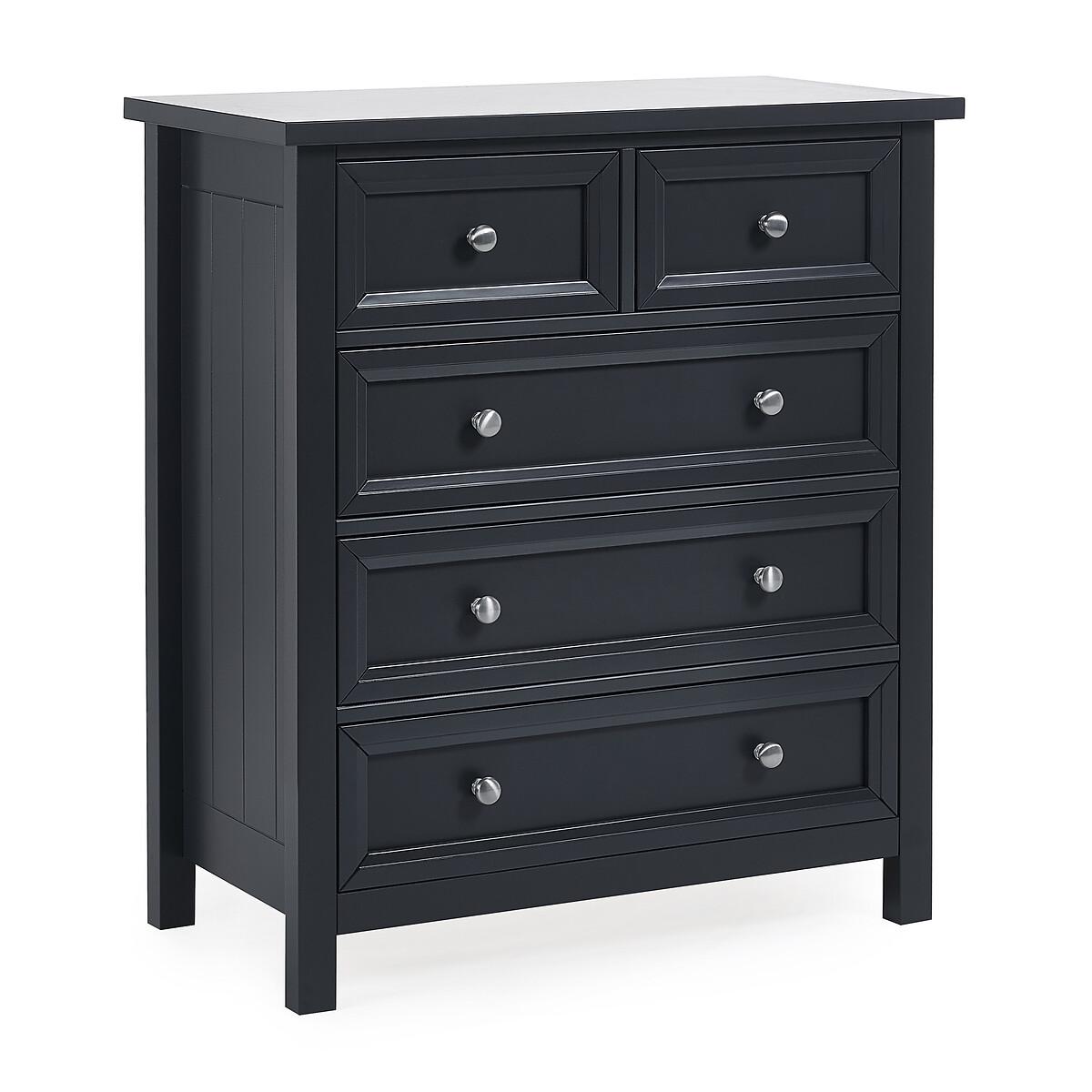 An elegant and simple New England style chest of drawers which has characteristic panelling beautifully finished in a hardwearing lacquer to create a soothing and refined aesthetic with timeless appeal. Detailed chamfered cabinetry and delicate pewter handles add the perfect finishing touch. Three large drawers offer ample storage for clothing and bedroom clutter, whilst two smaller drawers are perfect for storing make-up, hair brushes or lingerie. Product details • 5 drawers • Shaker style chamfered drawers • Round pewter handles • Shiplap style side panels • Square feet • Assembly required • Fixings supplied • 12 month manufacturers warranty. Product Composition - 95% Wood, 5% Metal. Product Dimensions - 44 cm x84 cm x94 cm , Weight - 33 KGPackage Dimensions - 98 cm x 48 cm x 22 cm, Weight 36.8 kg. Please note: this product cannot be be delivered to all Offshore Islands Northern Ireland or Republic of Ireland. This product will be dispatched by one of our trusted suppliers. You’ll be contacted by their selected courier about your delivery.