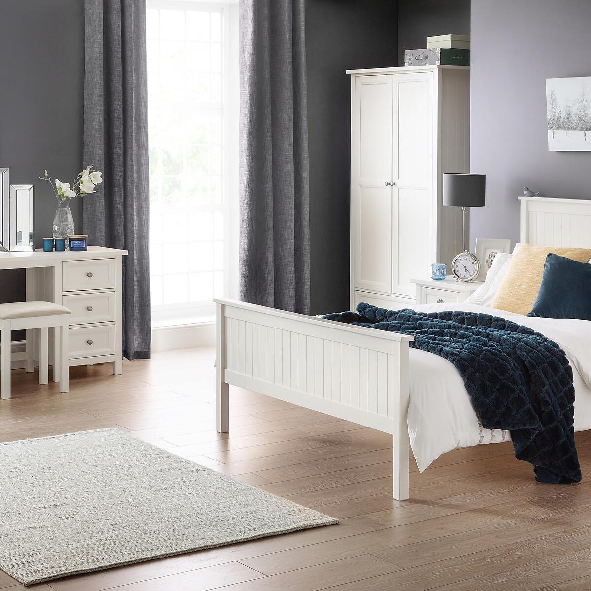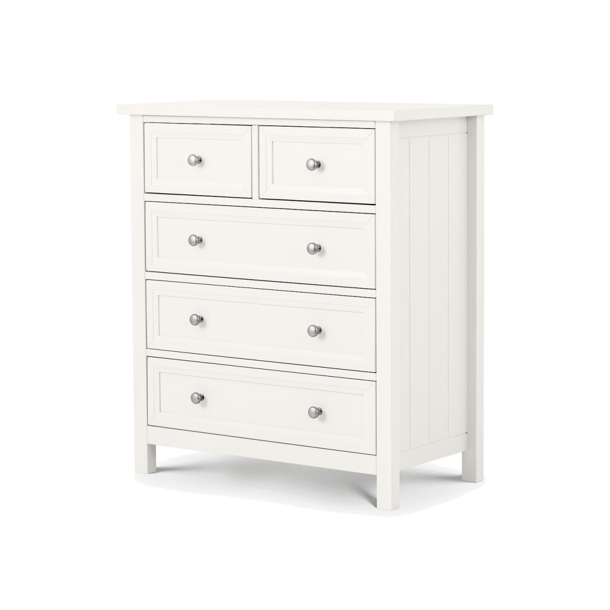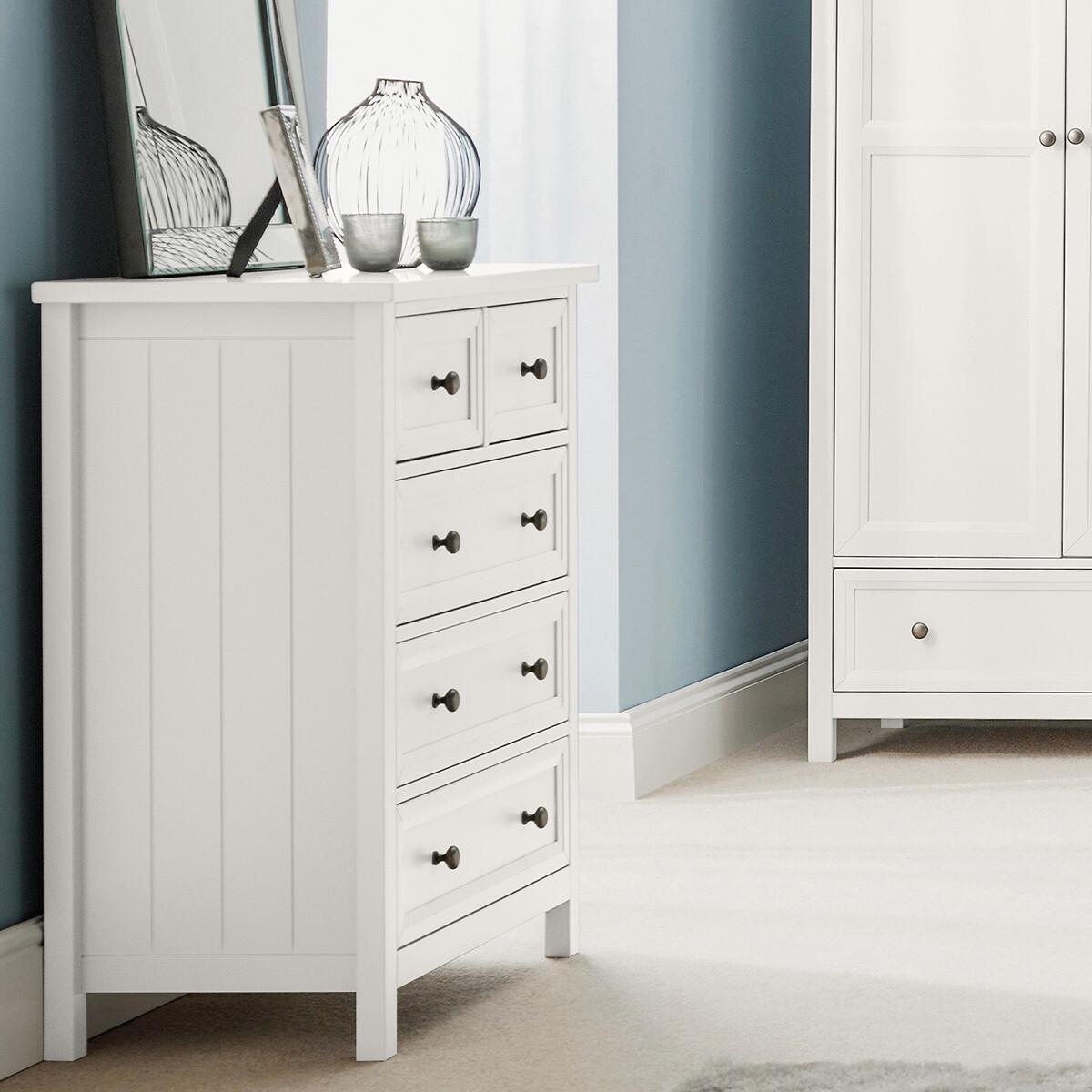 An elegant and simple New England style chest of drawers which has characteristic panelling beautifully finished in a hardwearing lacquer to create a soothing and refined aesthetic with timeless appeal. Detailed chamfered cabinetry and delicate pewter handles add the perfect finishing touch. Three large drawers offer ample storage for clothing and bedroom clutter, whilst two smaller drawers are perfect for storing make-up, hair brushes or lingerie. Product details • 5 drawers • Shaker style chamfered drawers • Round pewter handles • Shiplap style side panels • Square feet • Assembly required • Fixings supplied • 12 month manufacturers warranty. Product Composition - 95% Wood, 5% Metal. Product Dimensions - 44 cm x84 cm x94 cm , Weight - 33 KGPackage Dimensions - 98 cm x 48 cm x 22 cm, Weight 36.8 kg. Please note: this product cannot be be delivered to all Offshore Islands Northern Ireland or Republic of Ireland. This product will be dispatched by one of our trusted suppliers. You’ll be contacted by their selected courier about your delivery.