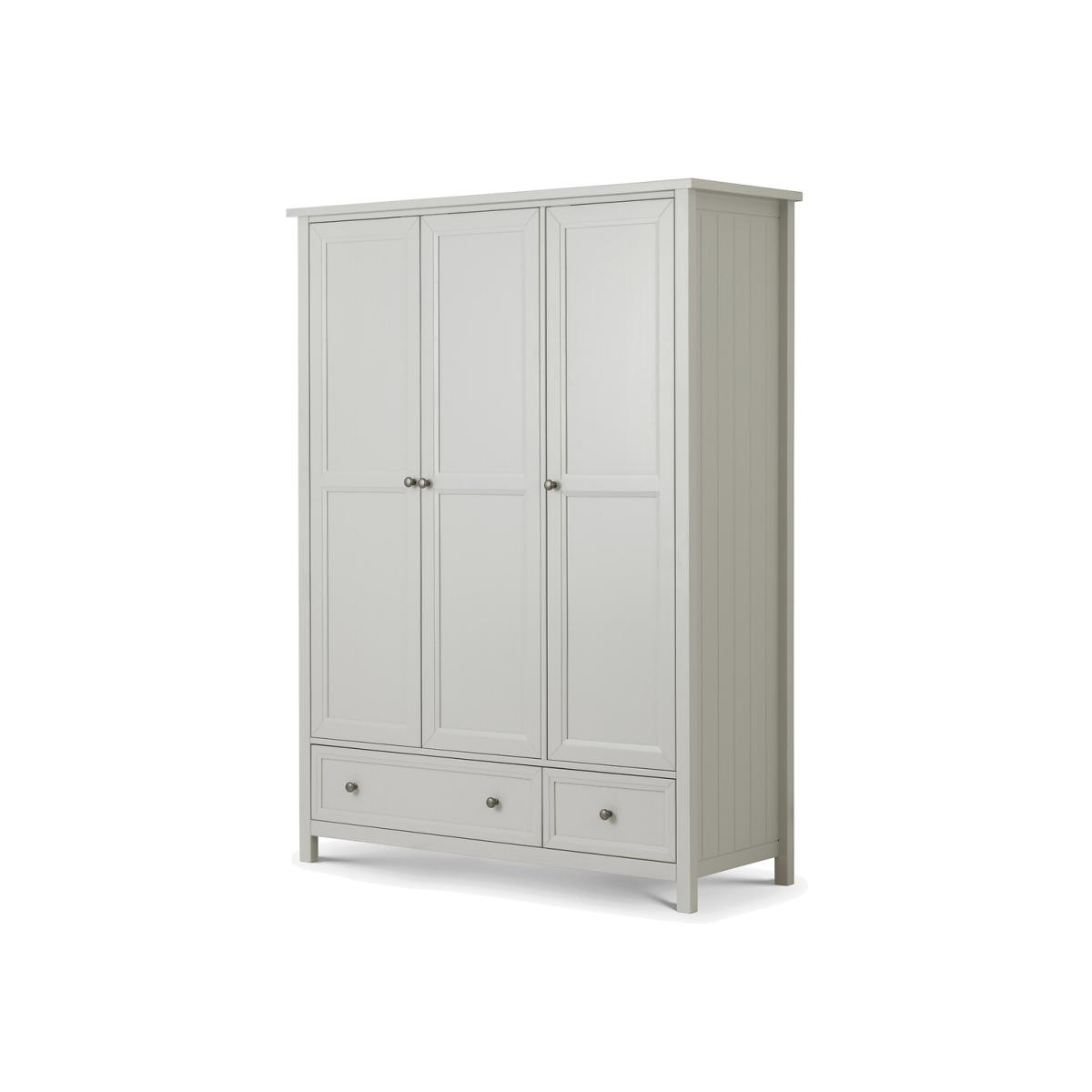 An elegant and simple New England style wardrobe, which has characteristic panelling beautifully finished in a hardwearing lacquer to create a soothing and refined aesthetic with timeless appeal. Detailed chamfered cabinetry and delicate pewter handles add the perfect finishing touch. Extra wide with 3 doors, it offers ample hanging space for dresses and suits, shelving compartments for T-shirts and knitwear, and two storage drawers perfect for storing shoes or bags. Product details • 3 door wardrobe • Single hanging rail in the double wardrobe compartment, 4 shelves in the single wardrobe compartment • 2 storage drawers (one large, one small) • Shaker style chamfered doors • Round pewter handles • Shiplap style side panels • Square feet • Fully finished back • Assembly required • Fixings supplied • 12 month manufacturers warranty. Product Composition - 95% Wood, 5% Metal. Product Dimensions - 55 cm x 141 cm x 190 cm , Weight - 95 KGParcel 1 Packaged Dimensions - 142 cm x 68 cm x 10 cm, Weight 42 kg Parcel 2 Packaged Dimensions - 192 cm x 65.5 cm x 18.6 cm, Weight 29 kg. Please note: this product cannot be be delivered to all Offshore Islands Northern Ireland or Republic of Ireland. This product will be dispatched by one of our trusted suppliers. You’ll be contacted by their selected courier about your delivery.