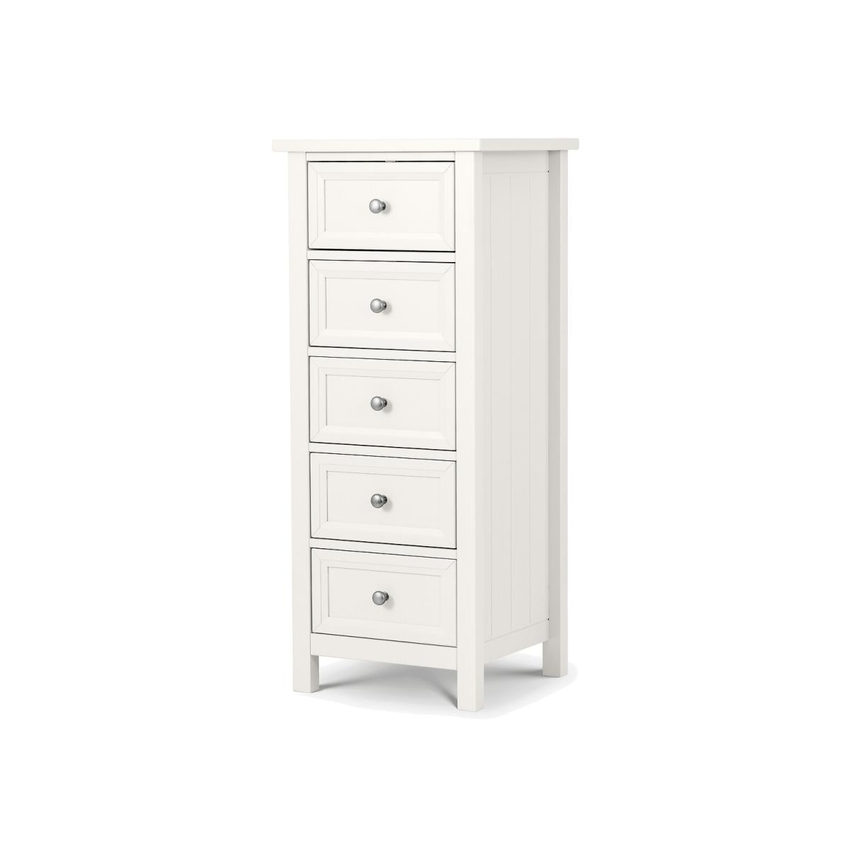 An elegant and simple New England style tallboy chest which has characteristic panelling beautifully finished in a hardwearing lacquer to create a soothing and refined aesthetic with timeless appeal. Detailed chamfered cabinetry and delicate pewter handles add the perfect finishing touch. Five well proportioned drawers offer ample storage for clothing and bedroom clutter. Product details • 5 drawers • Shaker style chamfered drawers • Round pewter handles • Shiplap style side panels • Square feet • Assembly required • Fixings supplied • 12 month manufacturers warranty. Product Composition - 95% Wood, 5% Metal. Product Composition - 95% Wood, 5% Metal. Product Dimensions - 44 cm x48 cm x114 cm , Weight - 26.5 KGPackage Dimensions - 127 cm x 50 cm x 14.7 cm, Weight 28.5 kg. Please note: this product cannot be be delivered to all Offshore Islands Northern Ireland or Republic of Ireland. This product will be dispatched by one of our trusted suppliers. You’ll be contacted by their selected courier about your delivery.