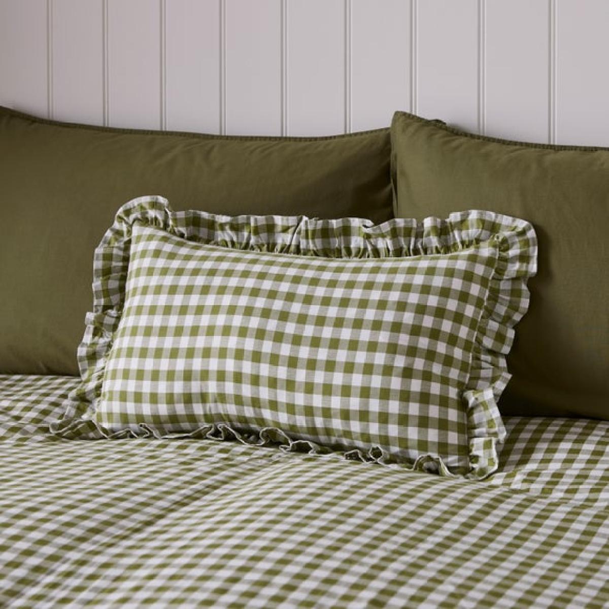 * Woven 100% cotton * Machine washable * Gingham design * Available in other sizes The Portloe Frilled Cotton Rectangle Cushion Cover is the perfect finishing touch for your bed, adding both comfort and style. This timeless woven gingham cushion allows you to effortlessly coordinate your bedding for a personalised look. Soft, stylish, and inviting - ideal for propping up while reading or lounging in bed.