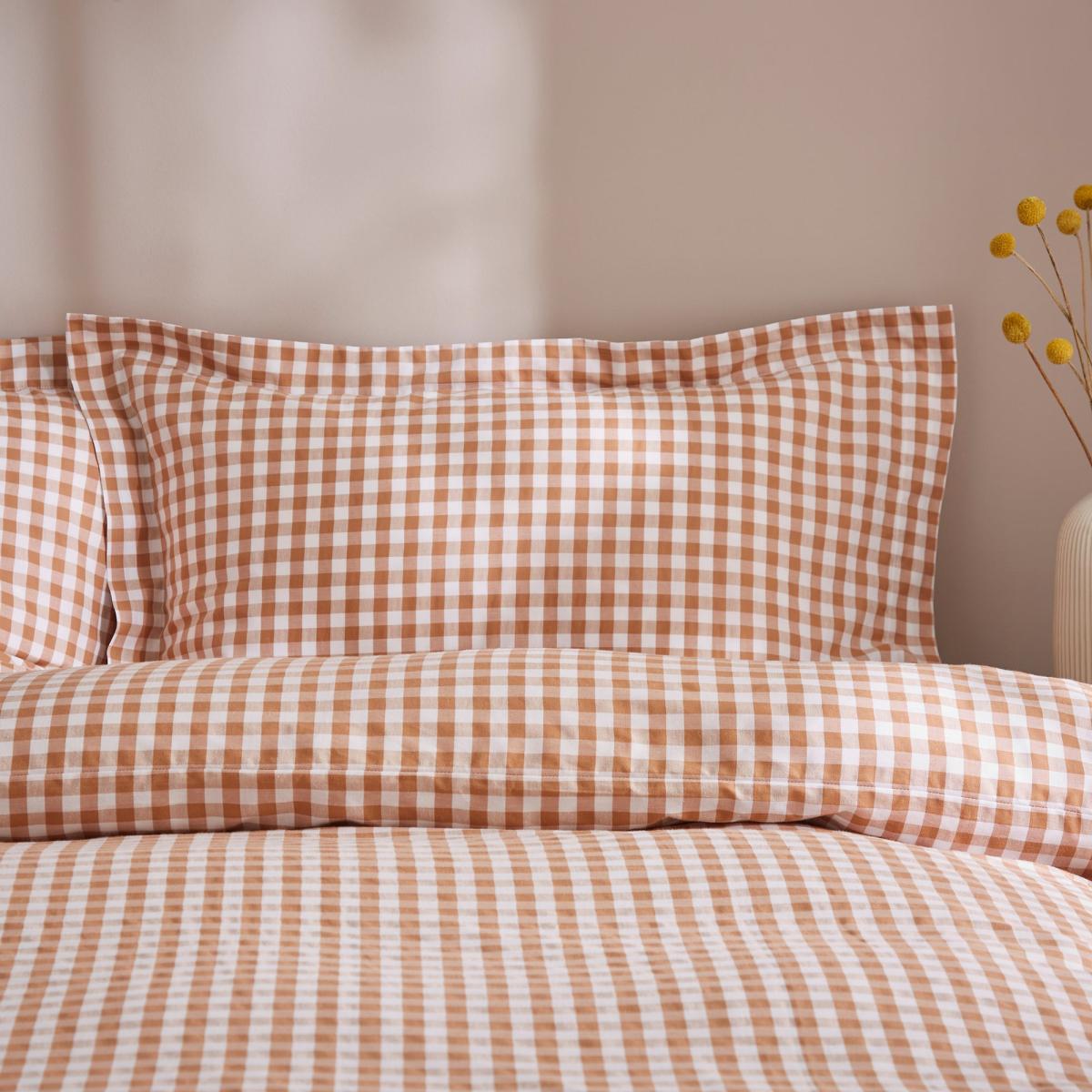 * Made from 100% cotton* Timeless gingham print* Oxford style pillowcase* Available in other colourways A delightful blend of comfort and style for your bedroom, crafted from 100% cotton, this pillowcase offers a soft and luxurious feel against your skin, ensuring a restful night's sleep. The timeless gingham print adds a touch of classic charm, while the Oxford style provides an elegant finishing touch to your bedding ensemble. Available in a range of other colorways, this pillowcase allows you to effortlessly coordinate with your existing decor or mix and match for a personalised touch. This product is OEKO-TEX MADE IN GREEN certified, meaning it was produced in OEKO-TEX S Te P certified factories - verifying environmental, social, and chemical standards in the facility. It has also been certified to OEKO-TEX STANDARD 100, the original safety standard for everyday confidence. To offer full visibility, the production stages throughout the supply chain can be traced.