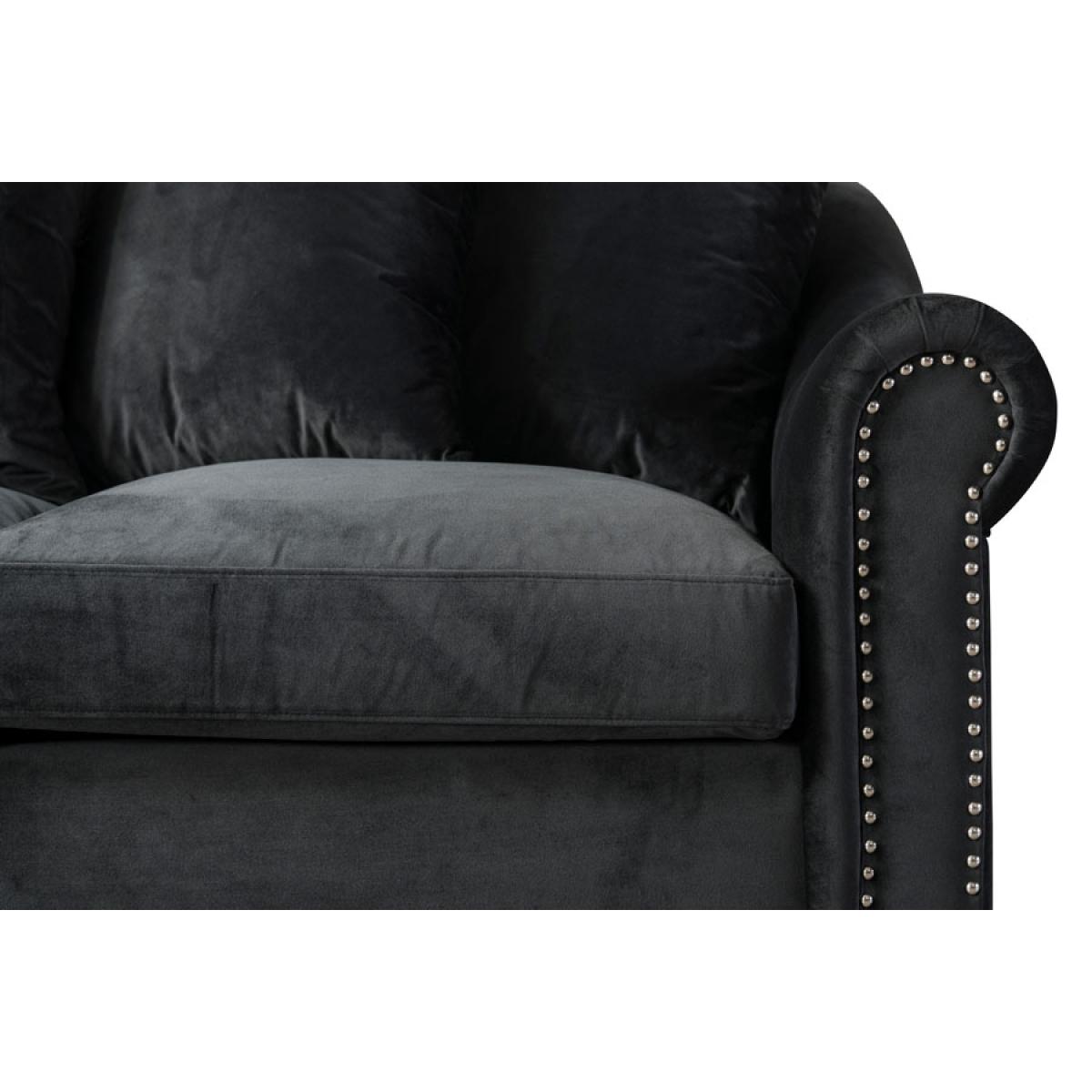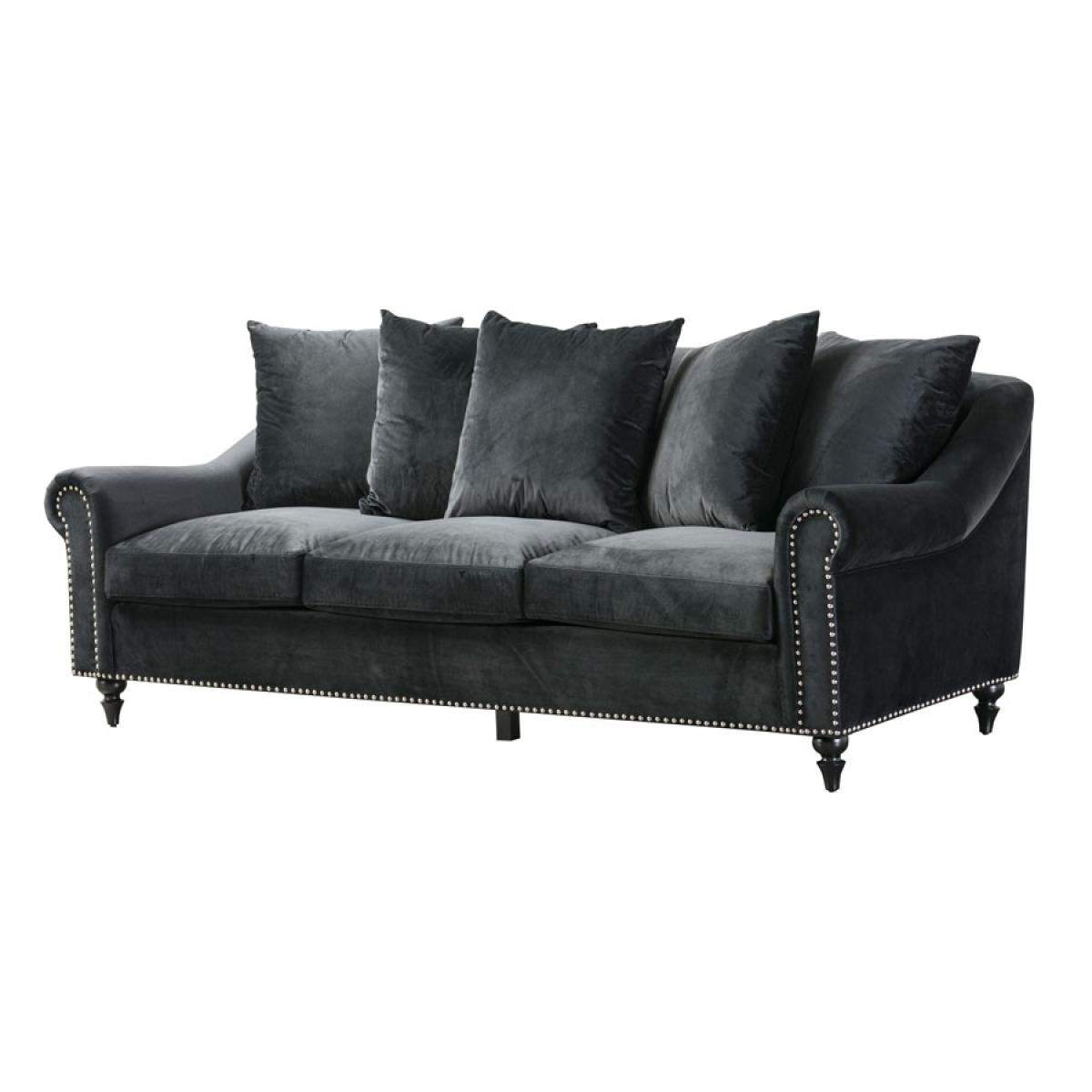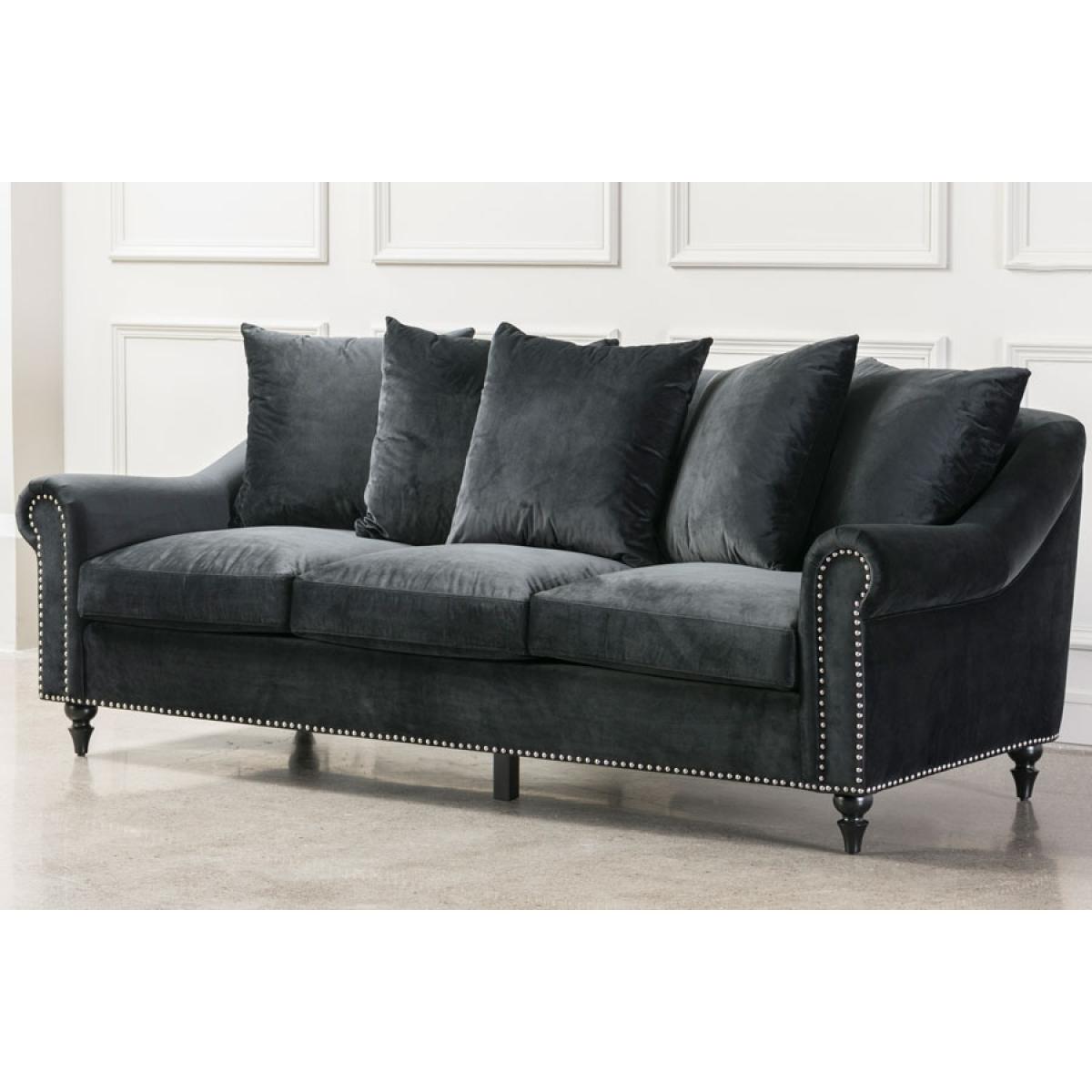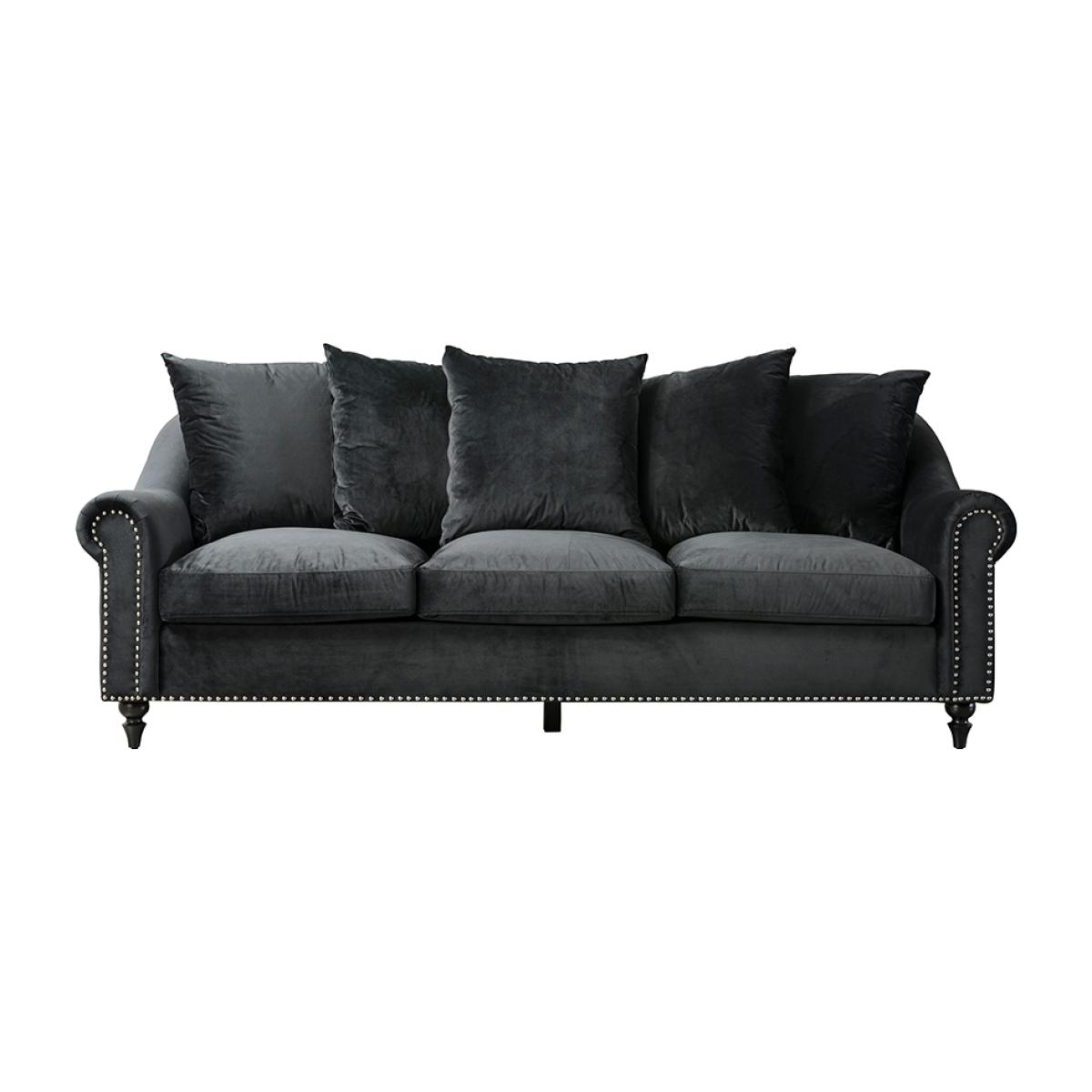 Classic, elegant sofa, designed for maximum comfort. Generous deep seat cushions filled with a combination of feather, foam and fibre. Five feather and foam filled scatter cushions included. Sprung seat and backrest. Solid ash legs with black stain. Chrome upholstery nails. Velvet upholstery fabric. In the unlikely event that you are dissatisfied with your sofa let us know (within 7 days) and we will happily collect it and fully refund you , including the return shipping cost.