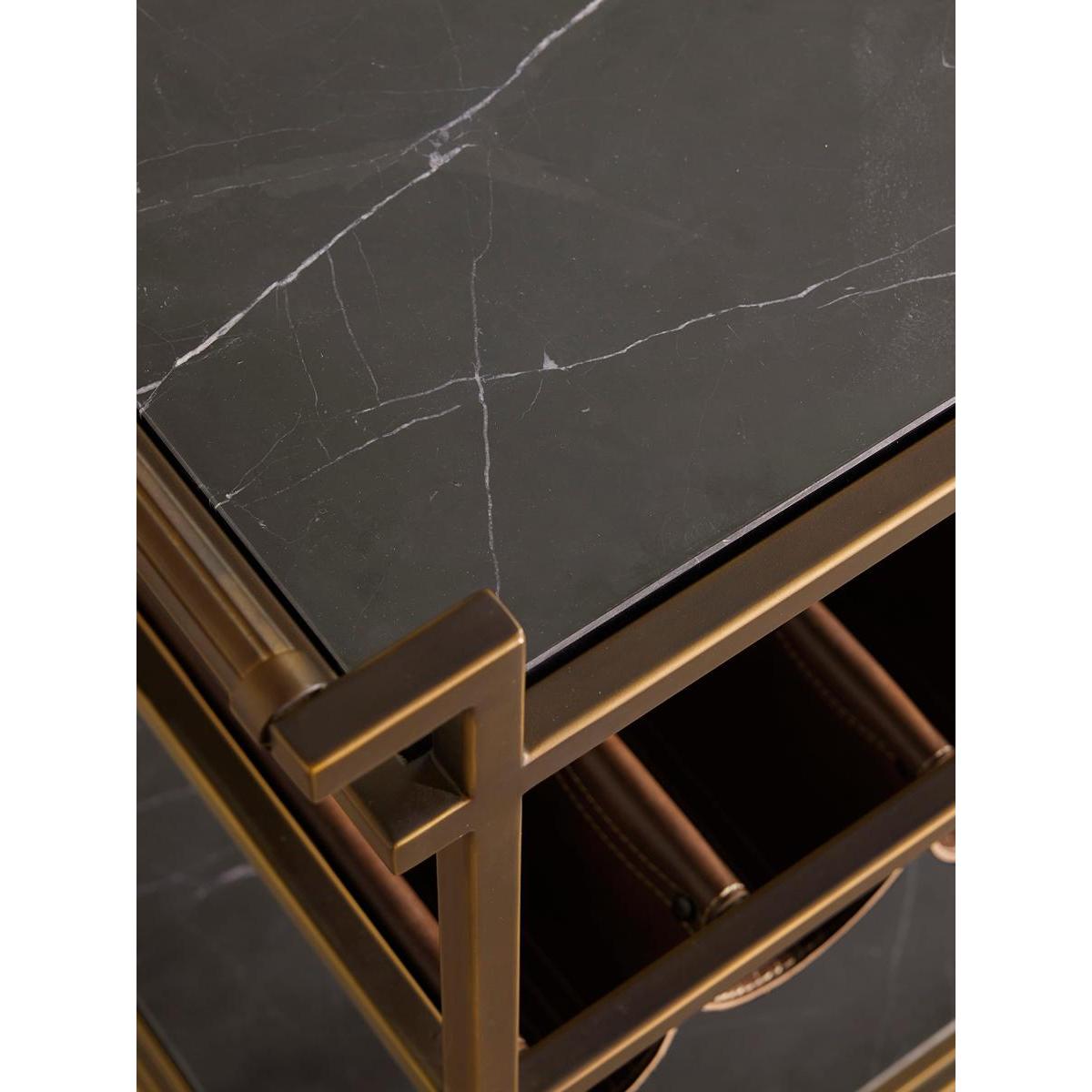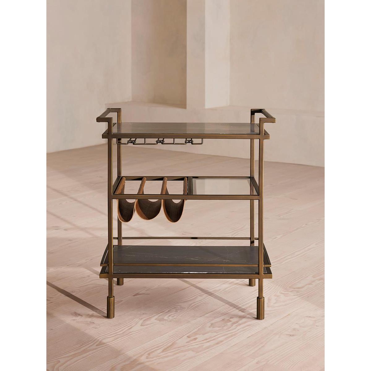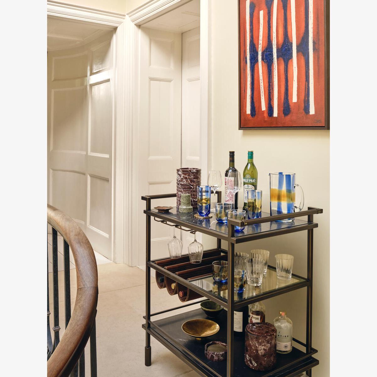 The Portnall bar cart echoes the textures seen at White City House. A blackened brass metal finish contrasts the Spanish black Marquina marble shelves, while a clear glass middle shelf is great for displaying everything from glassware to bar utensils and recipe books. Fitted with an adjustable wine rack, the bar cart features three leather slings - ideal for storing your favourite wine and spirits.
